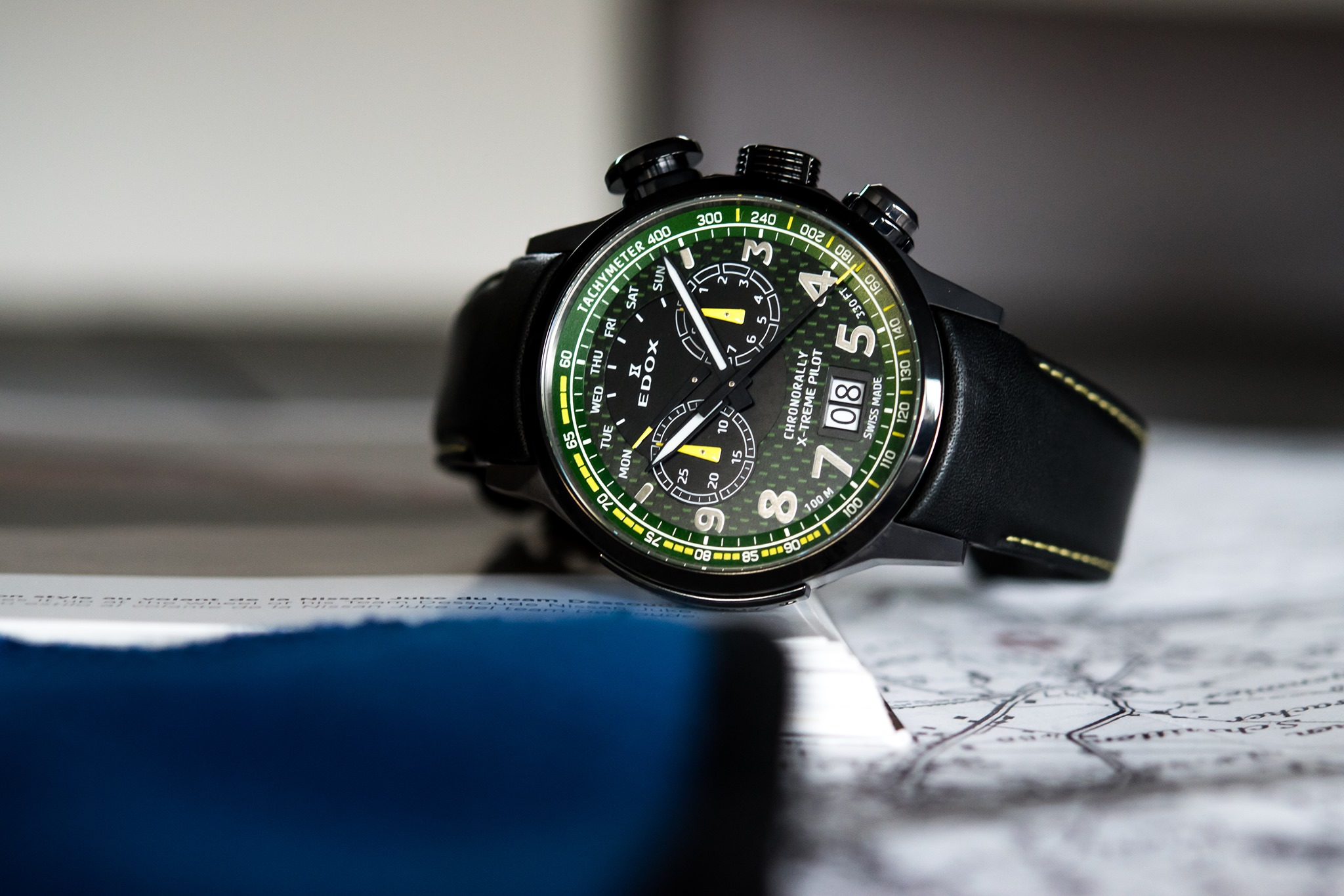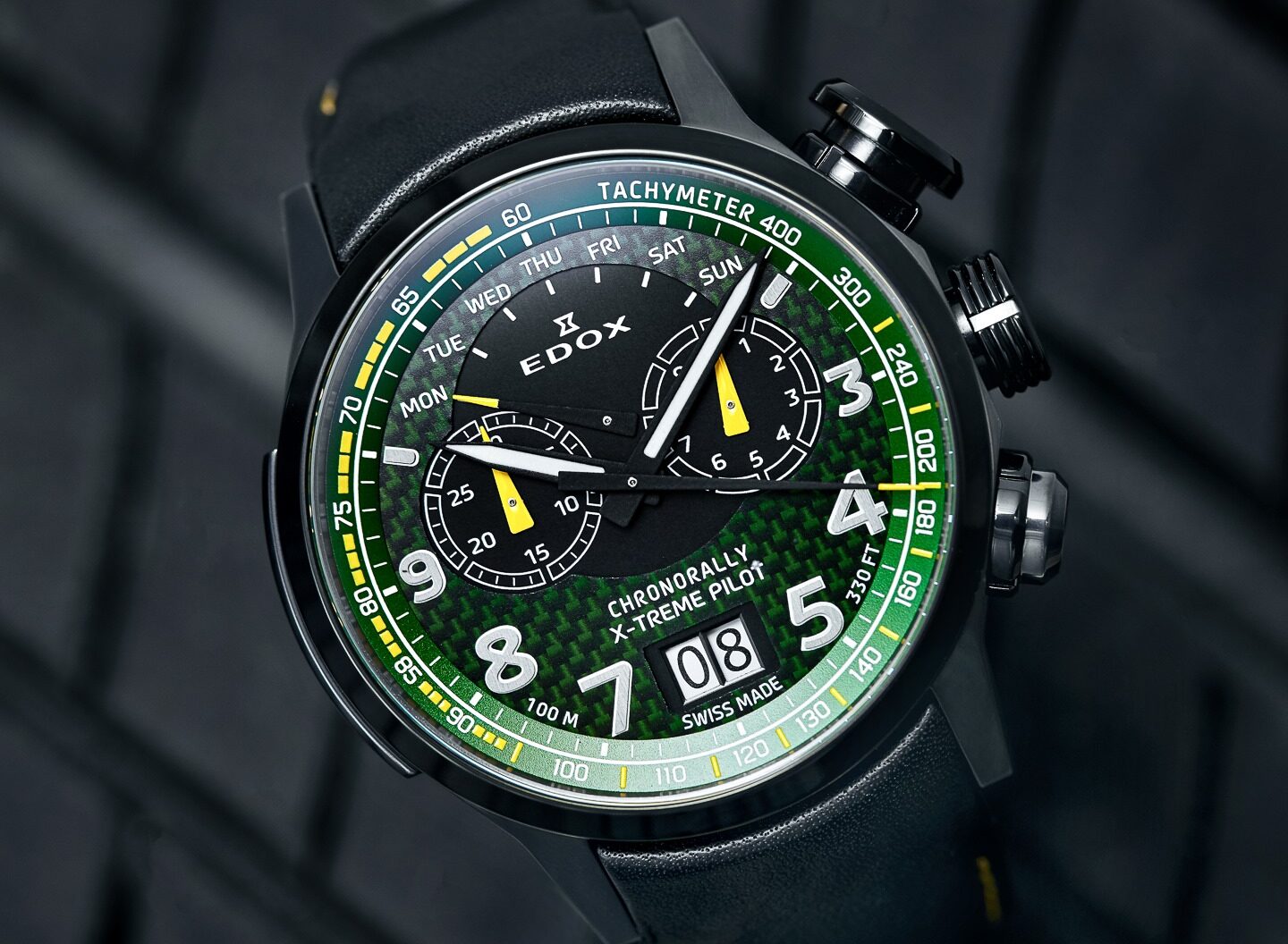 Cuenta con carátula verde y amarilla, que se inspira en los colores del tablero de un auto de rally. Diseñado para admirar las indicaciones en fracciones de segundo, el crono a décima de segundo se complementa por las funciones de un gran fechador, día retrógrado y demás.