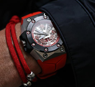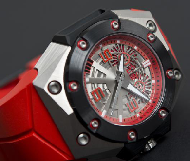 Presentado originalmente en Baselworld 2012, el Oktopus II Double Date sobresale por su llamativo color rojo y por la carátula de color titanio con detalles luminiscentes en rojo y negro a juego con su correa intercambiable de caucho rojo.
