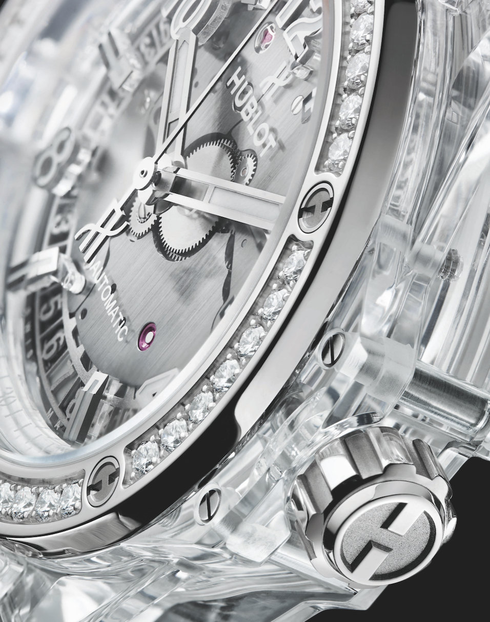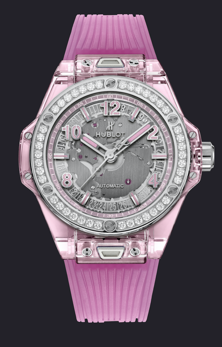 Su caja de 39 mm hecha de acero inoxidable con cristal de zafiro pulido en color azul o rosa pulido y 42 diamantes engastados de 1,00 quilates, marcan la diferencia sobre todos los relojes antes presentados por la firma. Misma que ha captado la atención femenina gracias al savoir-faire que impregna Hublot en la creación de joyas relojeras.