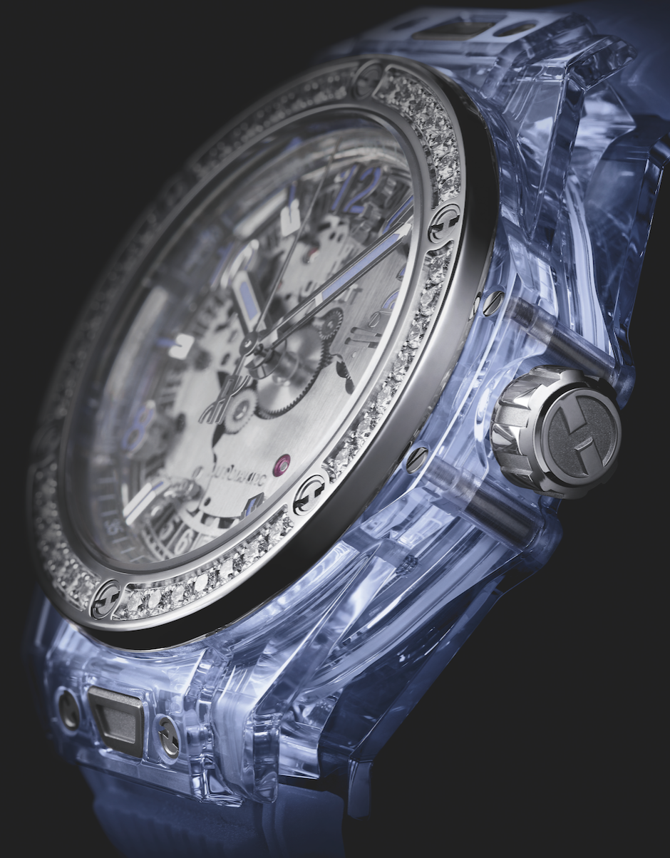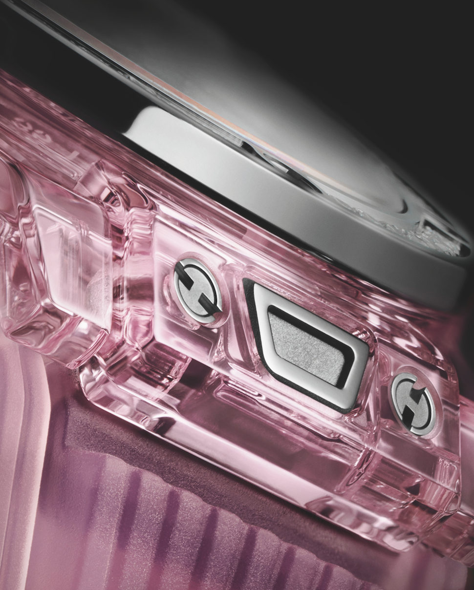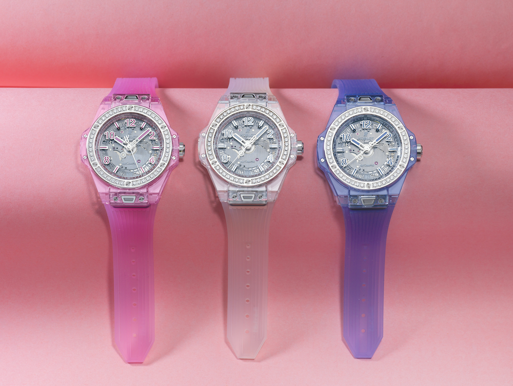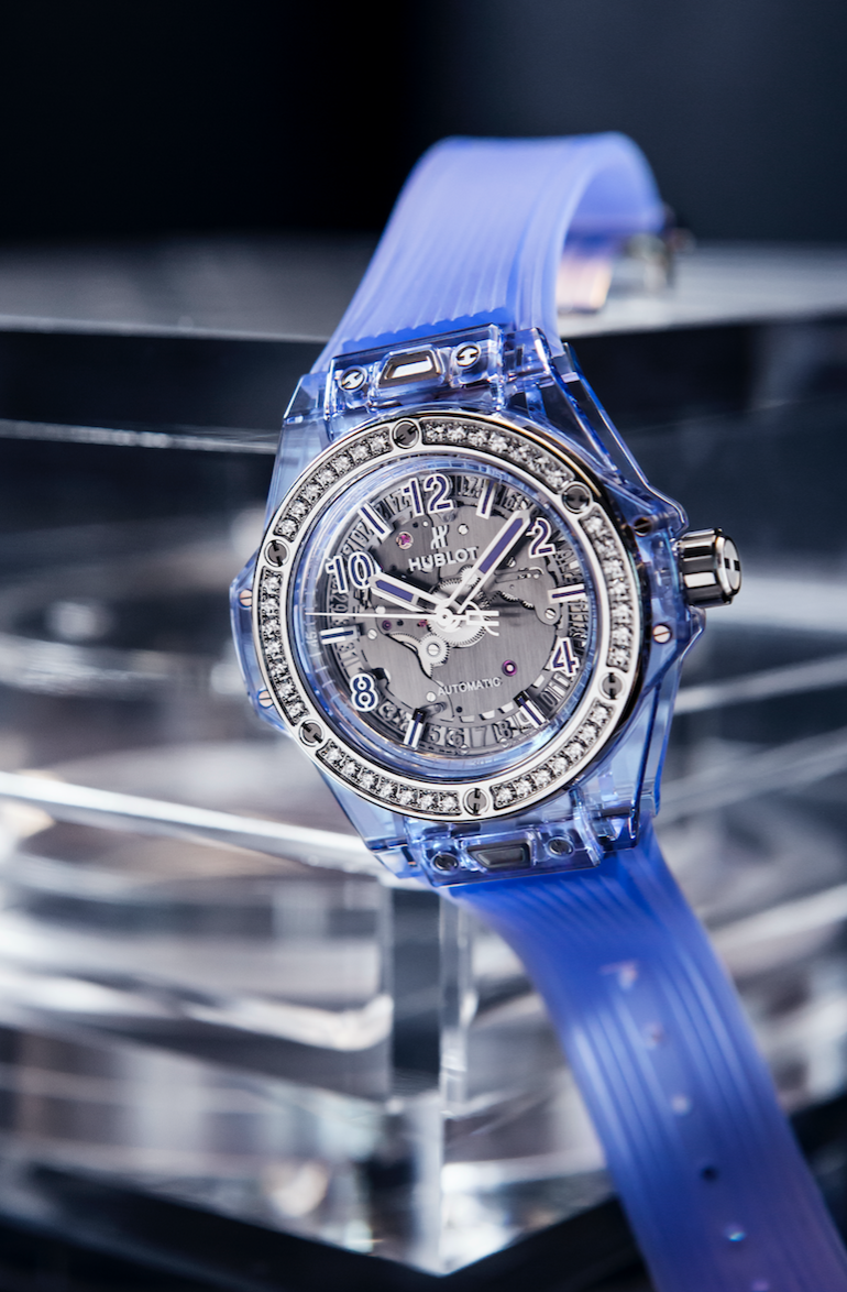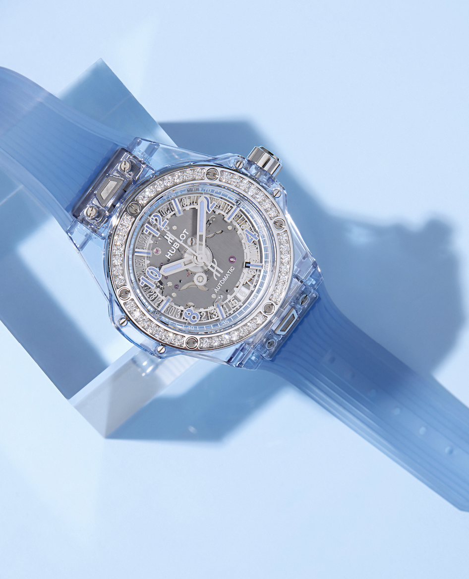 Disponible en tonalidades rosas y celestes, el Big Bang One Click Sapphire se ajustará a la muñeca de una mujer multifacética a través de un brazalete de caucho transparente con hebilla y cierre desplegable de acero inoxidable que incorpora su vez su sistema de fijación patentado como “One Click”