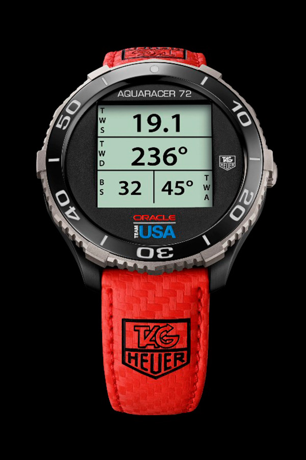 Ok, ok, es súper avanzado, pero ¿cómo se ve?… La apariencia acuática de la línea se respeta, pero la tecnología modifica completamente la carátula, y es obvio, las informaciones deben permanecer legibles en todo momento, por lo que un sistema de alto contraste tipo LED, exhibe la información constantemente actualizada de la embarcación, cómo se comporta, la dirección ángulo del viento, la ruta que se sigue; la velocidad del bote, etc. Cada dato es importante y la actualización de los datos en tiempo real incrementa la capacidad de reacción de los navegantes.Como era de esperarse, para el desarrollo de la pieza, TAG Heuer echó mano de las tecnologías probadas en sus líneas de Eyewear y SmartPhone. El Aquaracer 72 incorporó el sistema patentado Splashproof, mientras que el procesamiento de datos queda “sellado” gracias a los avances waterproofed del cronógrafo Monaco. Y tomando en cuenta las tareas de los marineros “grinders” del Oracle Team USA, que requieren visualizar la información al primer golpe de vista, el departamento Eyewear de TAG Heuer desarrolló una tecnología fotosensible, mientras que Jimmy Spithill, jefe del equipo se comunica con cada miembro del equipo gracias al teléfono Racer Sub Nano atado a su brazo, poseedor de la tecnología móvil MERIDIIST de TAG Heuer.