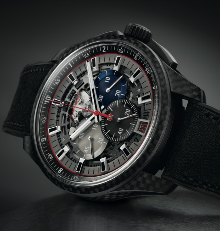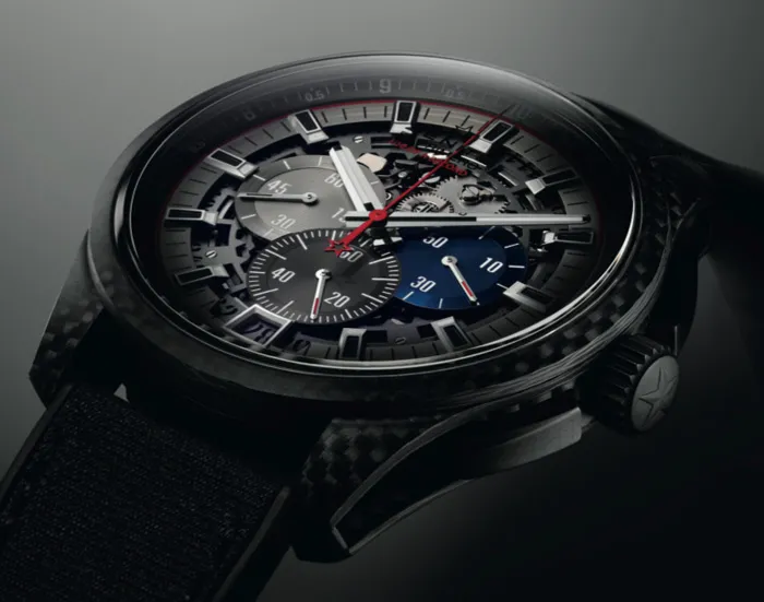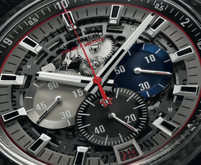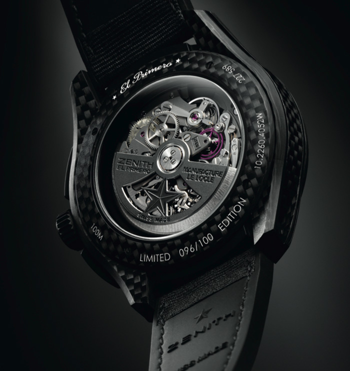Bajo la consigna de ser mucho más ligero y deportivo, las 100 piezas poseen el mecanismo de segundero fulminante, al tiempo de modificar los materiales gracias al research de la manufactura con el titanio, empleado en la aeronáutica, disciplina de la cual Zenith es amo y maestro. Este material ha llegado a reemplazar al latón de la platina y puentes, mientras que la rueda de cronógrafo fabricada en silicio, así como el áncora y rueda de escape –fabricadas en el mismo material–, ofrecen prestaciones sobresalientes que entregan cifras increíbles: 15,45 g, una reducción de pesos equivalente a un cuarto del original de 21,10 gramos.