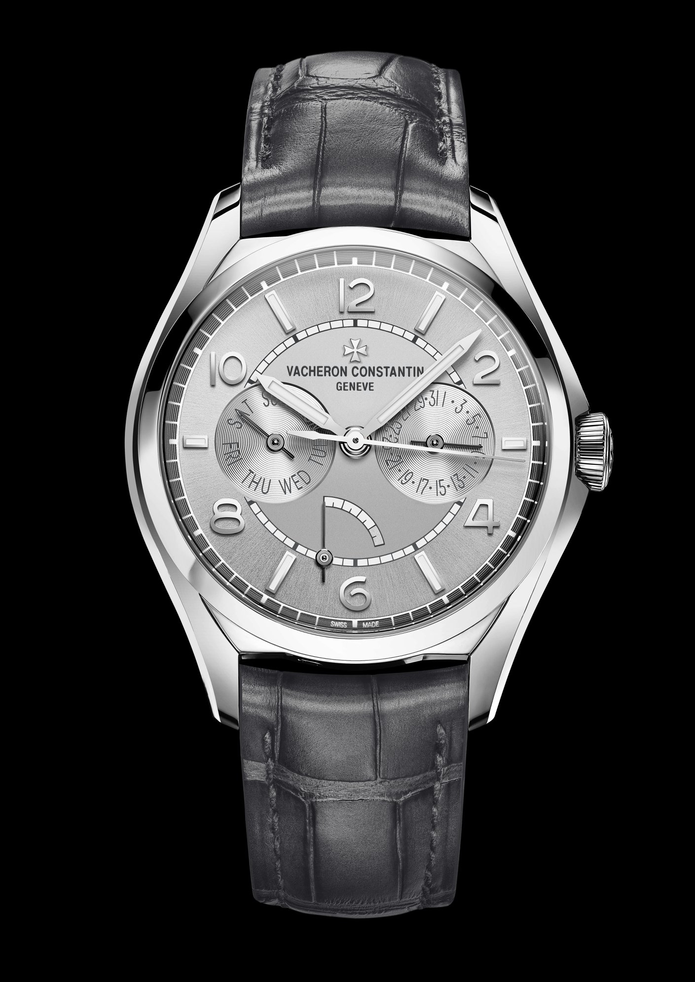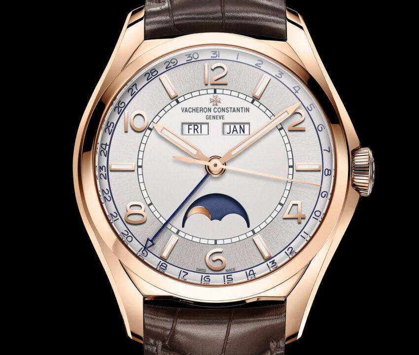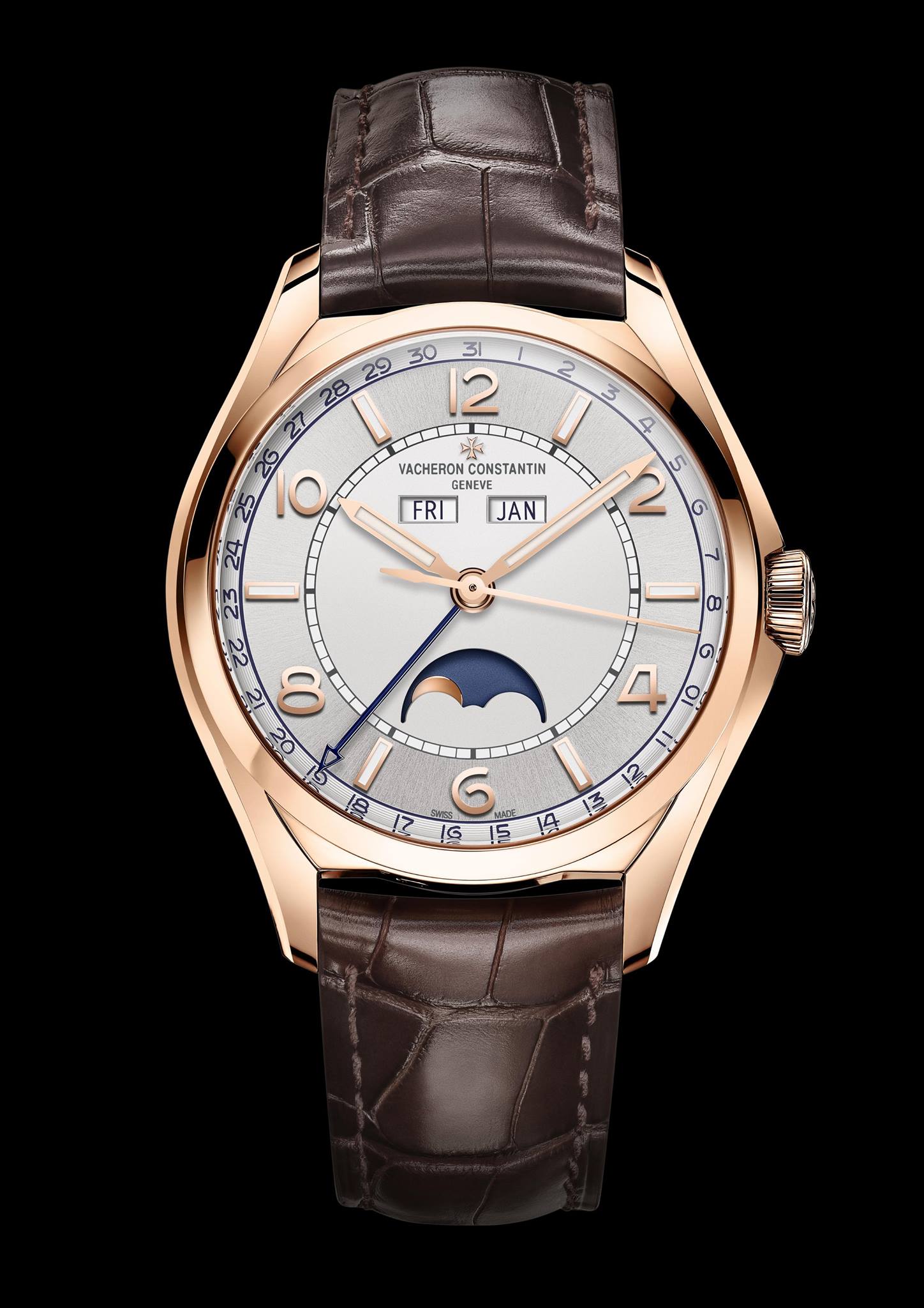 Enfocándonos en la familia de este año, Vacheron Constantin presenta tres relojes: el primero con fecha, el segundo con fecha-día e indicador de reserva de marcha, y un tercero con calendario completo e indicación de fase lunar. Mientras más complicaciones, las ventanillas empiezan a realizar la magia del círculo interior de la carátula. En la más complicada de ellas, muestra la maestría por la facilidad de lectura con la fase de Luna a las 6 h, y dos ventanillas rectangulares; a la izquierda con la fecha y a la derecha el día, ejecutadas de manera magistral, concediendo una simetría extraordinaria al reloj. La aguja azul concéntrica da la indicación del día del mes.