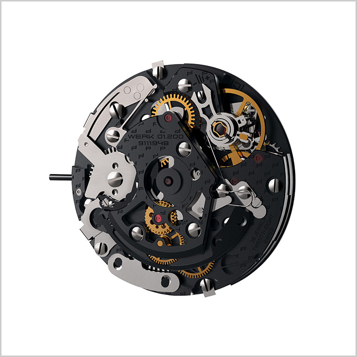 Una función de cronógrafo convencional registra eventos sucesivos a través de tres acciones consecutivas en el empujador: detener, restablecer y reiniciar el reloj. Para el Chronograph 911 Turbo S Exclusive Series, Porsche Design ha desarrollado su primer movimiento propio, lo nombra Werk 01.200, y se trata de un cronógrafo con función flyback para la ejecución ágil de los pasos del cronógrafo: start, stop, reset. Este motor es desarrollado con base a la construcción de uno de los mecanismos con cronógrafo flyback más precisos de la historia, no obstante componentes y performance han sido ampliamente mejorados.