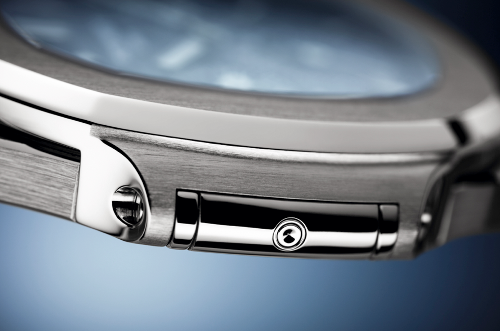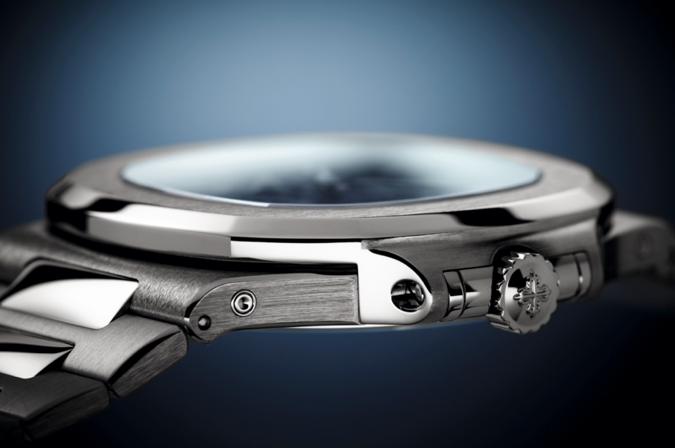 Desarrollado en caja de oro blanco de 18 quilates, exhibe las indicaciones de manera magistral sin perder un ápice la elegancia deportiva inherente a la colección. En cuanto a la estética, destaca la configuración tradicional color azul para el dial y las agujas aplicadas con tratamiento luminiscente. Postdata: es sumamente complejo presentar un Nautilus en oro, ya que los múltiples acabados que sugiere la caja complican el trabajo ante un material tan dócil.