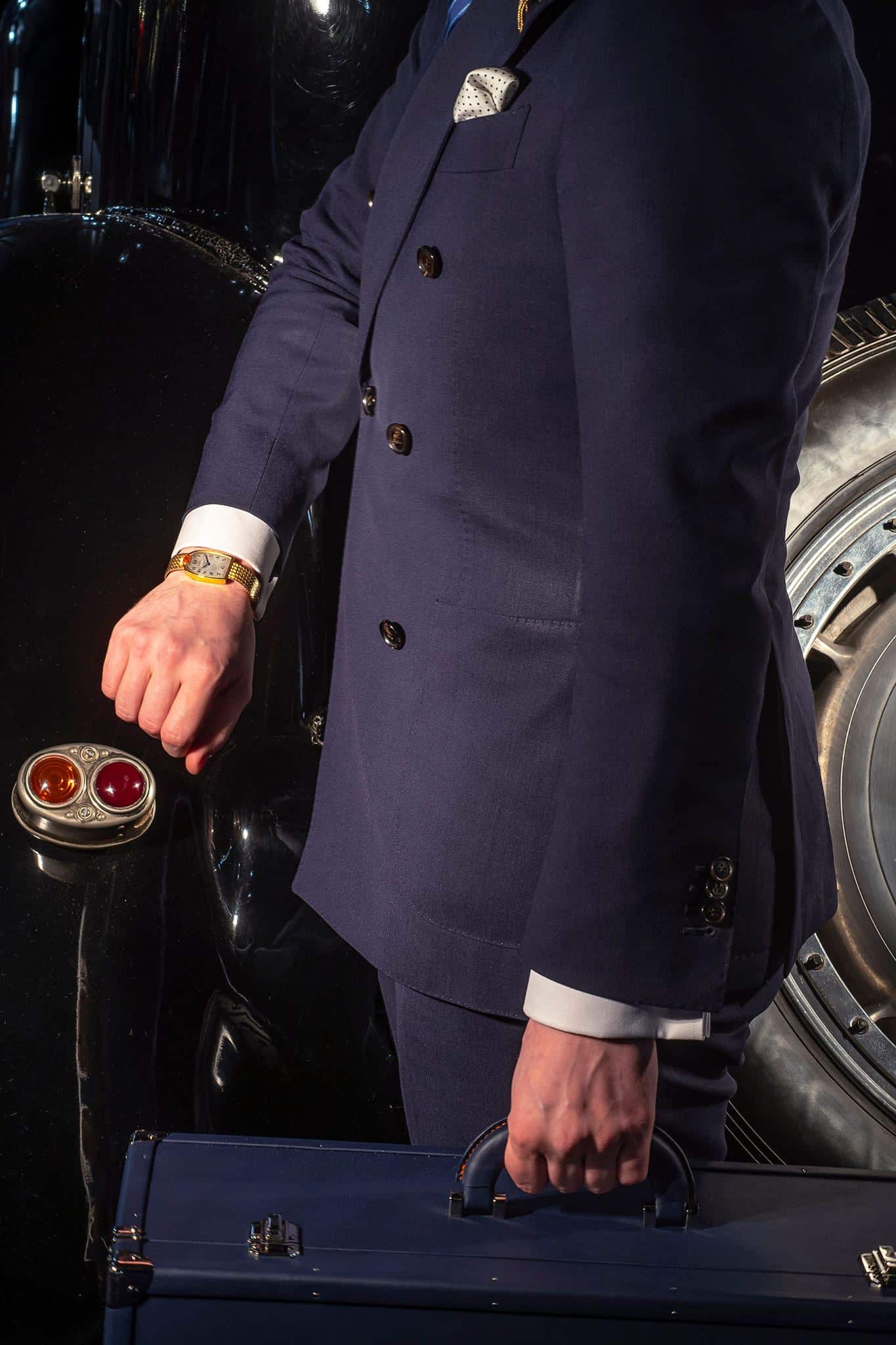 - Caja: oro amarillo en forma de parrilla del radiador, típica de los coches Bugatti, logo de la marca esmaltado en rojo y corona sinuosa estilizada en forma de tapón de radiador a las 12 horas, con bisagra trasera original, en el interior del carrura tapada como los salpicaderos de los coches de competición de la marca.