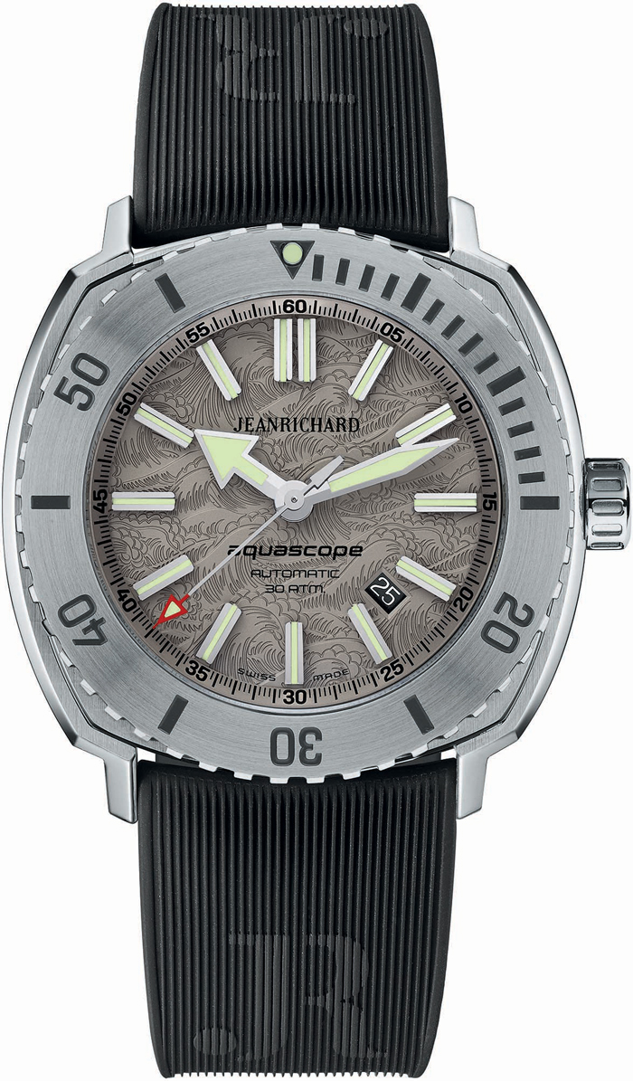 Aquascope: movimiento mecánico automático calibre in-house a 28,800 a/h; reserva de marcha de 38 horas, calibre JR60; caja de acero satinado de 44 mm y hermeticidad de hasta 300 m; horas, minutos y segundos con fechador.