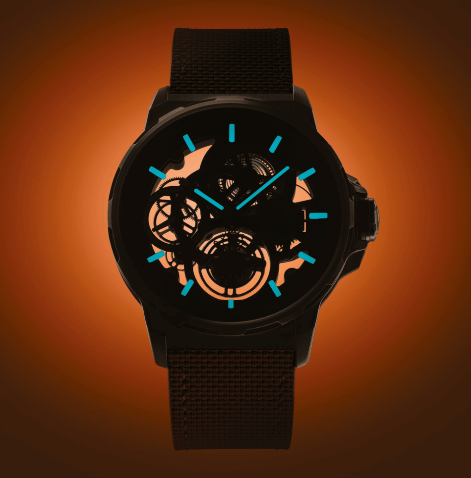 El Flying Tourbillon Skeleton Titanium, Orange Edition está diseñado con una hipnotizante asimetría que transmite energía y movimiento: el gran barrilete que asegura la distribución estable de energía está posicionado a la 1 h y equilibra el pequeño segundero que se aprecia a las 9 h así como el tourbillon que se ubica a las 6 h y completa una rotación por minuto.