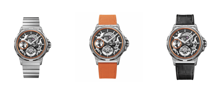 Puede ser llevado con elegancia, gracias a su brazalete de titanio satinado, o destacar en un ámbito más casual, o incluso deportivo, pues incluye dos correas más: una de piel negra y otra de caucho color naranja que se intercambian con facilidad pues cuenta con un eficiente sistema de liberación rápida.