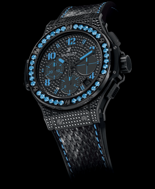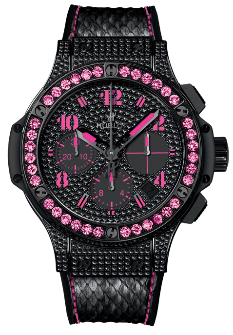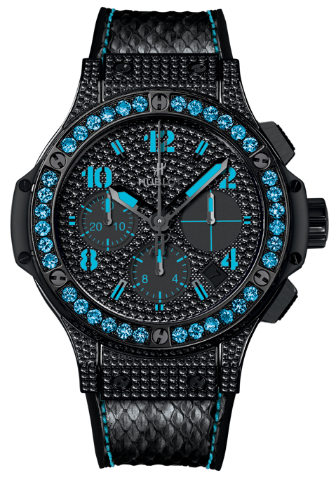 El toque final lo brinda la correa de piel de pitón negra brillante cosida sobre caucho negro con costuras tono sobre tono azules, amarillas, rosas o verdes fluorescentes según la versión. Y ya que como dice la canción Girls just wanna have fun!, estas vistosas piezas relojeras ofrecen una hermeticidad de hasta 100 metros, el verano está completo gracias a Hublot.