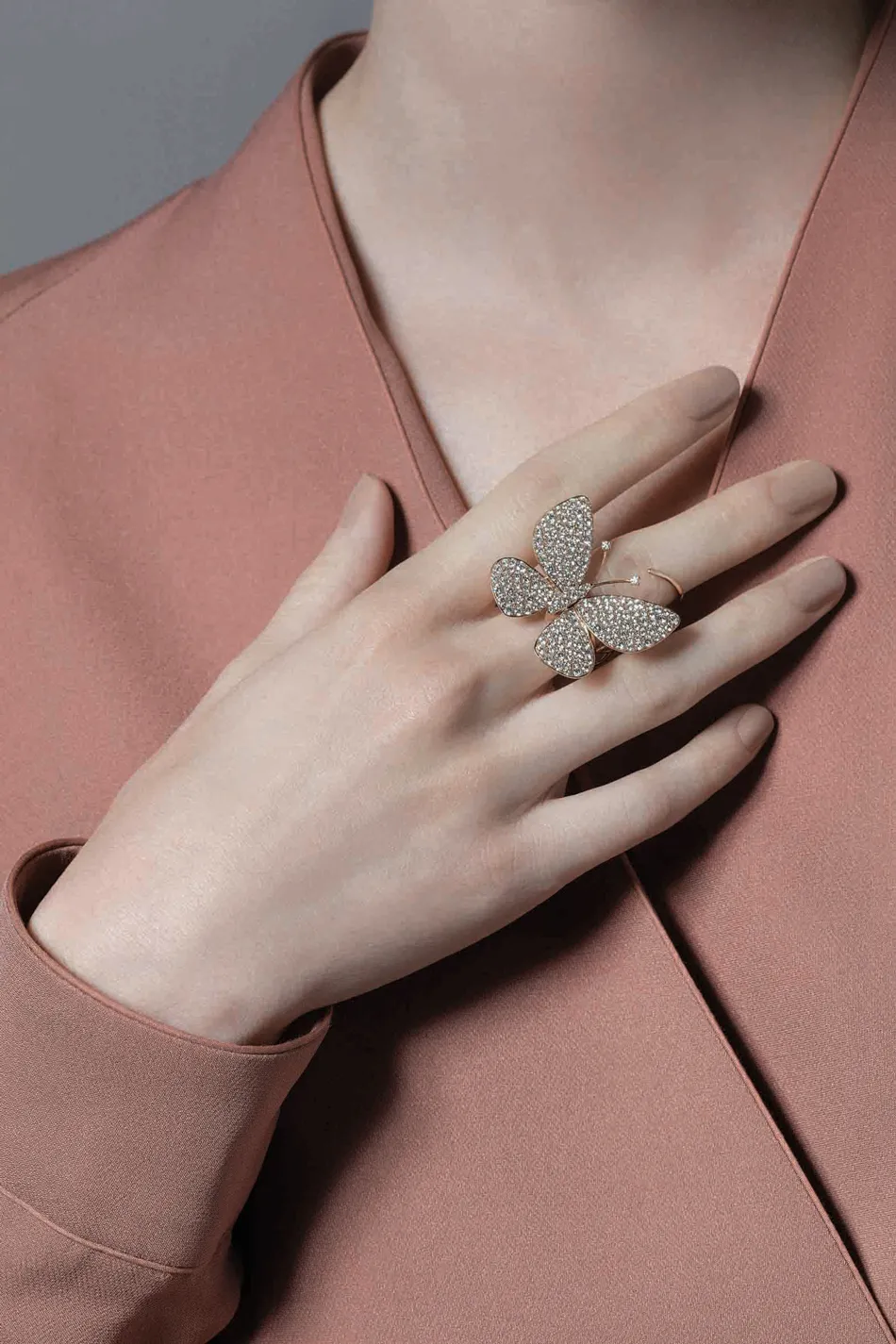 En montura de oro blanco o rosa de 18 quilates, el resultado final se entrega en diamantes, zafiros y/o rubíes para las dos versiones en oro blanco, mientras que un pavé de diamantes en cuerpo, alas y antenas está destinado para la creación de oro rosa, para un look más atemporal y elegante.