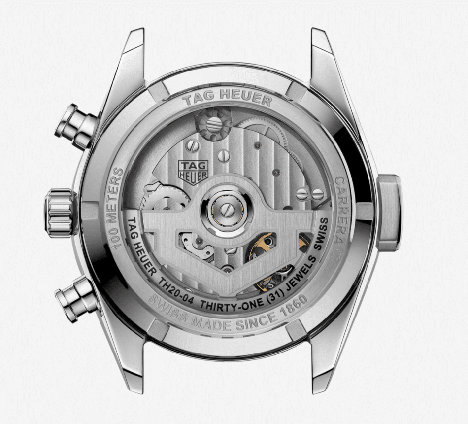Impulsando este TAG Heuer Carrera Chronograph Seafarer está el calibre TH20-04 con un embrague vertical y una rueda de pilares que garantizan, además de la precisión, la fluidez en los pulsadores. El movimiento se aprecia a través del fondo abierto de la caja, cubierto con cristal de zafiro y grabado con la corona de la victoria. Otorga una reserva de marcha de hasta 80 horas y es hermético hasta 100 metros.
