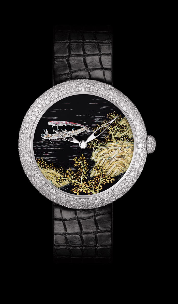 Este año la colección se ha visto enriquecida con nuevos modelos, como el Coromandel, donde el trabajo en la carátula es simplemente espectacular. Esta pieza única manufacturada en Suiza tiene una caja en oro blanco de 18 quilates, engaste nieve con 571 diamantes (4.13 quilates).