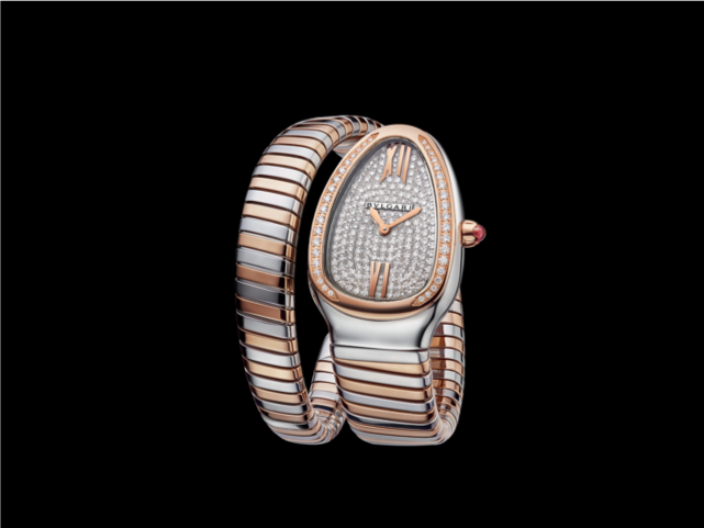 Para una de nuestras colecciones favoritas, Bvlgari presenta dos piezas. Serpenti Tubogas que es un movimiento de cuarzo alojado en una caja de acero curveada de 35mm. Su bisel es en oro rosa y está engastado con diamantes, representativo de la casa relojera.