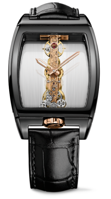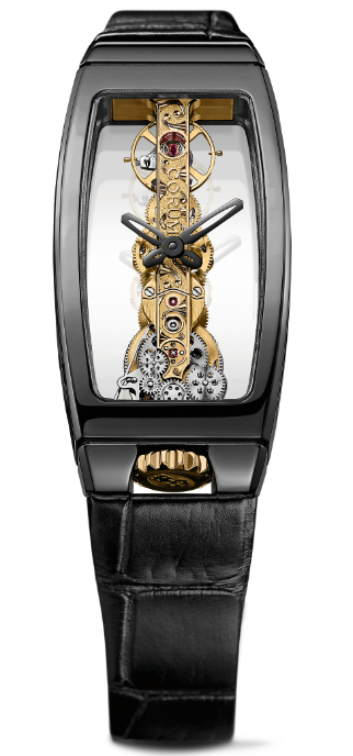 Tras 35 años de deslumbrar a los coleccionistas relojeros con su movimiento baguette, Golden Bridge ha sufrido significativos cambios, tanto estéticos como mecánicos, con mejoras que le conceden una mejor eficiencia y regularidad de marca.En esta ocasión, el nuevo Miss Golden Bridge se resguarda en una caja esbelta de cerámica en forma tonneau que, en esta ocasión se desprende de las asas a fin de integrar la correa de piel de cocodrilo directamente a la caja, brindando confort y sumando a la estética de la misma.