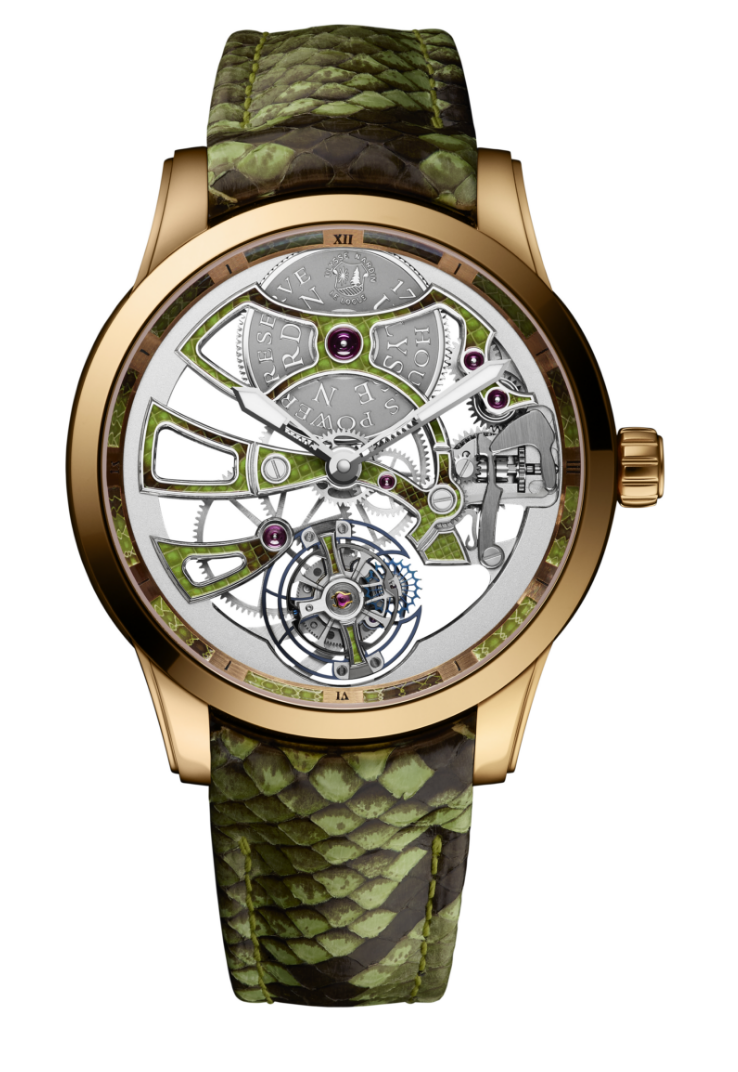 Esta referencia en oro rosa de 18 quilates cuenta con tourbillon que contrarresta los efectos de la gravedad y le añade precisión, además de que en él se exhibe el segundero y sus puentes son invisibles. Su movimiento es de carga manual y tiene un diámetro de 40mm. Disponible con brazalete de oro, platino o correa de piel.