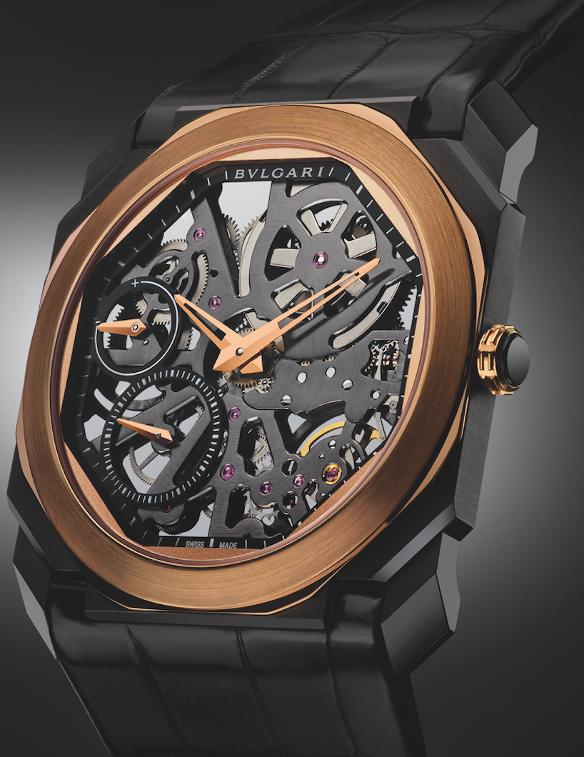 Su construcción calada permite al portador dar un vistazo a su movimiento ultra delgado que vive dentro de una caja de acero de 40 mm de diámetro y 5,37 mm de ancho. La carátula está rodeada de un bisel en oro rosa que combina con la corona. El recubrimiento negro de la platina y los puentes contrastan con el resto de los componentes. Su calibre de carga manual 128SK goza de una reserva de marcha de 65 horas.