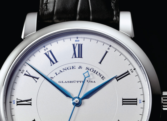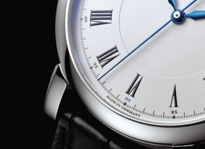 A.Lange & Söhne resalta dicha tradición de fácil lectura y novedosa precisión mediante el Richard Lange de este año (primera edición fabricada en 2006), que exhibe a través de su carátula plateada: indicadores en números romanos y manecillas en acero azulado, conjunto rematado por la leyenda -en posición de las 12 h- “Made in Germany”, como sello de la casa con sede en Glashütte.