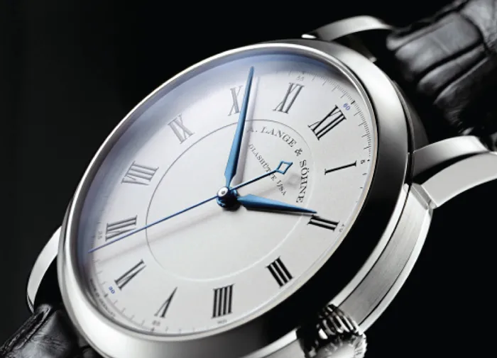 A.Lange & Söhne resalta la tradición de fácil lectura y novedosa precisión mediante el Richard Lange de este año, que exhibe a través de su carátula: indicadores en números romanos y manecillas en acero azulado, conjunto rematado por la leyenda: “Made in Germany”, sello de la casa.