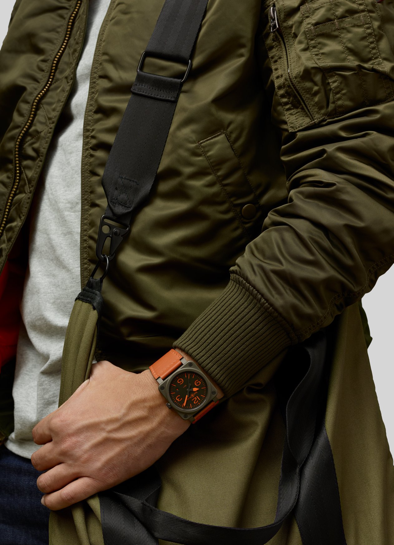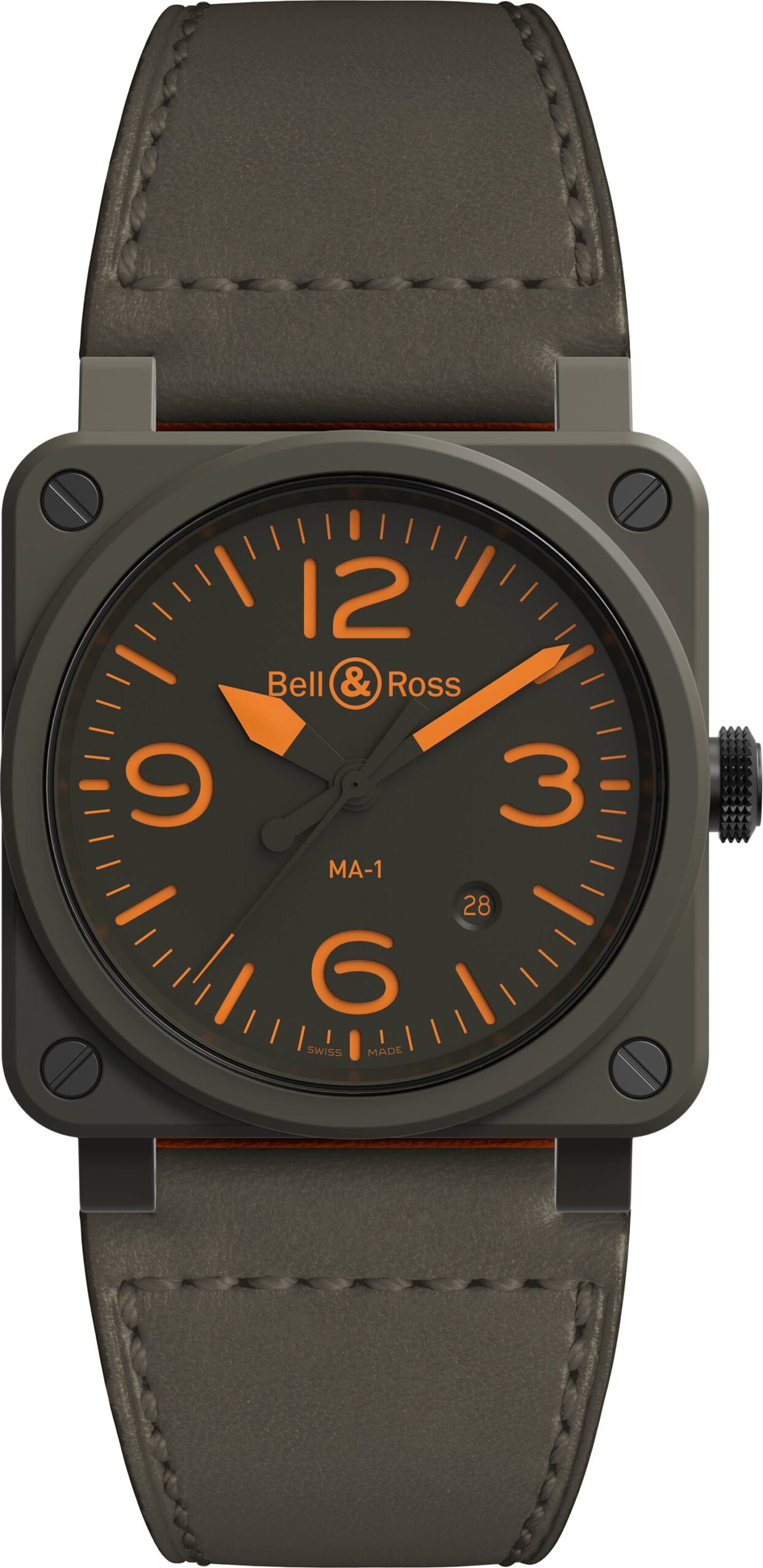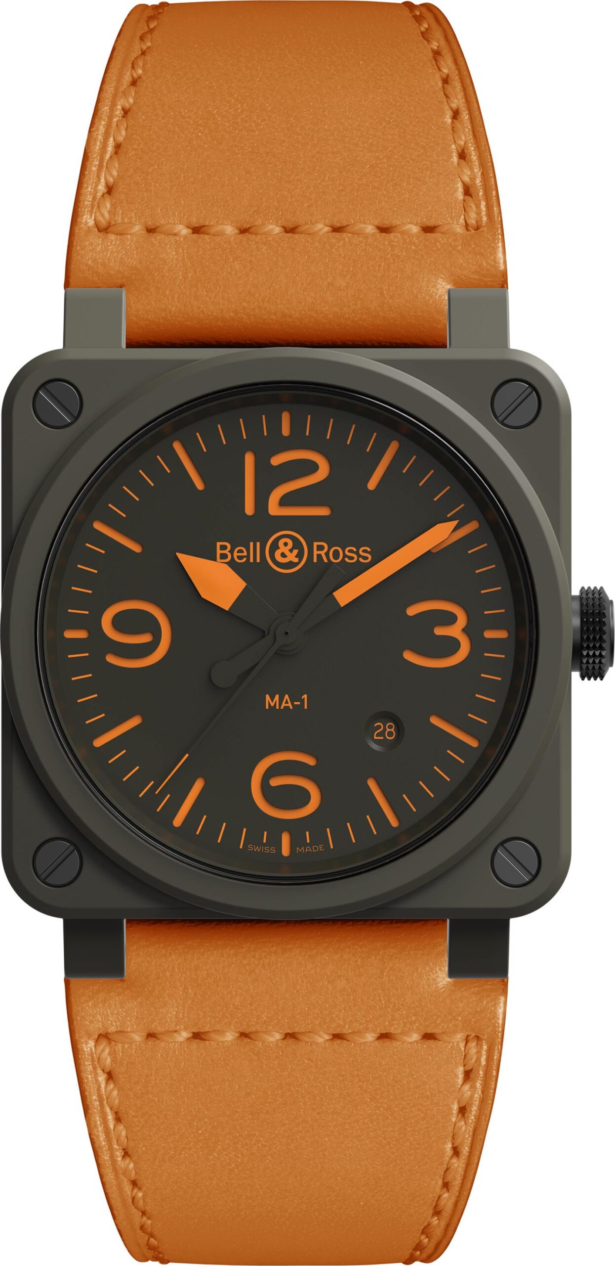 La pieza luce una construcción de 42 mm de diámetro para la caja hecha de cerámica caqui mate, mientras que en el interior vibra el calibre mecánico automático BR-CAL.302. La carátula está desarrollada a partir de dos placas: una superior en color caqui mate recortada, a fin de dejar ver la carátula inferior con revestimiento de Super-LumiNova® color naranja.