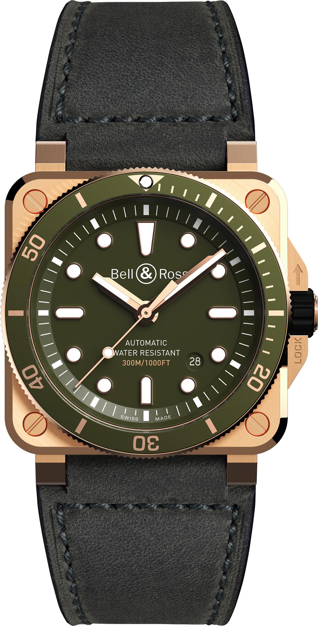 En cuanto a códigos estéticos, la referencia luce una carátula color verde olivo con inserciones en Super-LumiNova®, agujas doradas y bisel con inserción de aluminio anodizado, se abraza al pulso mediante una correa de piel de becerro gris verdoso y/o caucho negro. En el interior vibra el calibre BR-CAL.302, mecánico automático.