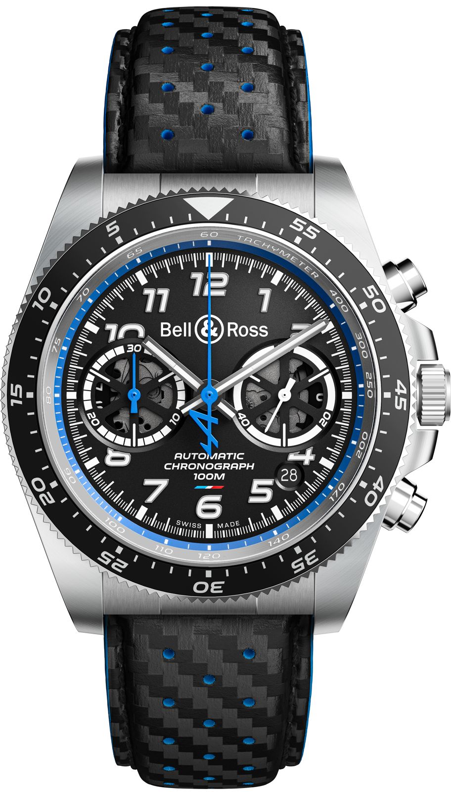 Este reloj es una Edición Limitada de 500 piezas y luce caja cuadrada, icónica de Bell & Ross. Este de acero adopta la forma BR-03 de 42mm, la carátula es similar al del BR V3-94, pero la fecha se ha ubicado en las 6 en punto. Incorpora sutiles toques de “azul Alpine”, concretamente, en las dos agujas del cronómetro. El bisel giratorio bidireccional ofrece una cuenta regresiva de 60 a 0 minutos, muy útil al comienzo de una carrera. Los pulsadores se inspiran en las paletas de cambio de los volantes de la F1, y lucen acabado PVD negro. La correa de caucho perforada es más ligera y transpirable, lo que ayuda a que la muñeca respire en situaciones de calor.