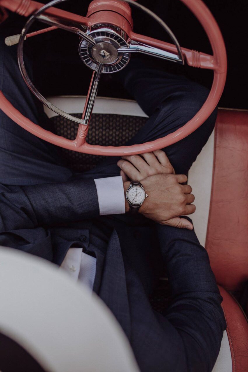 bastidor de minutería. También portan indicaciones internacionales tipo teléfono público de vieja escuela para 3, 6 y 9 minutos en el contador de minutos del cronógrafo. Finalizamos con correas de piel de caimán Sfumato a juego.