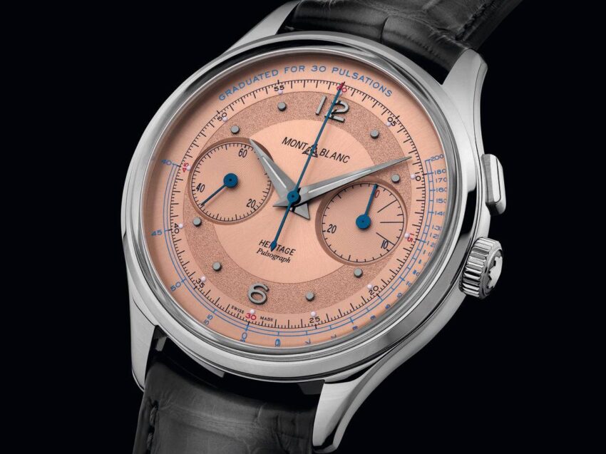 Un reloj inspirado por lo que los coleccionistas denominan los relojes de doctor que fueron usados por los médicos en el pasado para revisar el ritmo cardíaco de un paciente. El reloj de 40 mm viene en acero y está accionado por el calibre de cronógrafo monopulsador de la Manufactura de Montblanc MB M13.21, visible a través de la tapa trasera, e incluye una indicación de pulsógrafo de doctor graduada para 30 pulsaciones. Su elegante carátula en forma de domo color salmón presenta varios códigos de diseño vintage que pueden apreciarse en los relojes de pulsera Minerva de la década de 1940 y 50: carátula en forma de cúpula con colores y acabados diferentes en dos zonas, números arábigos aplicados en antracita y puntos como índices, manecillas Dauphine dobladas para las horas y minutos centrales con revestimiento Super-LumiNova* y manecillas azuladas en forma de bastón.