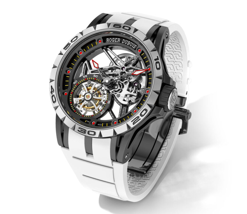 Su caja de titanio de 42 mm dota a la pieza de carácter pero también de una ligereza excepcional, ahora sujetada a la muñeca por una correa blanca de coma que contrasta con los acentos de rojo y amarillo de la carátula, en donde se exhibe el puente en forma de estrella tan característico de los movimientos esqueleto de Roger Dubuis.