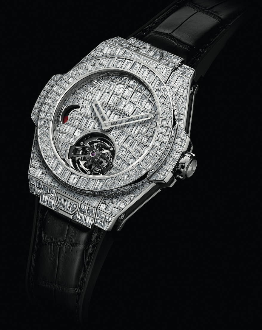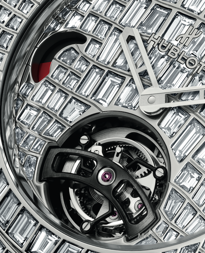 Propulsado por calibre HUB6016 con movimiento de cuerda automática y un tourbillon que habita en una caja de 45 mm de diámetro, engastada con 234 diamantes baguette más (un valor total de 7,6 quilates) , el Big Bang Tourbillon Croco ofrece hasta 115 horas de reserva de marcha, lo que equivale a más de cinco días.