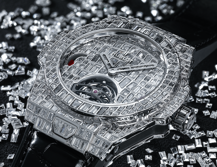 Cuando se habla de diseños inéditos y extravagantes, entonces el Big Bang Tourbillon Croco será el tema principal. Este modelo que incorpora 380 diamantes baguette con apariencia de escamas de cocodrilo y gemas incrustada en su totalidad, será la pieza ideal por un hombre llamativo y varonil.