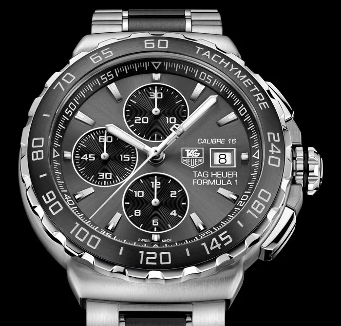 TAG Heuer F1 Calibre 16 // Movimiento: mecánico automático / Calibre: 16 / Frecuencia: 28,800 a/h / Caja: 44 mm de acero pulido y cepillado / Cristal: zafiro / Corona: a rosca / Carátula: antracita con dos totalizadores de cronógrafo y fechador a las 3 h / Bisel: cerámica / Indices: tipo espada con tratamiento luminiscente / Funciones: horas, minutos y segundero a las 9 h / fechador, escala taquimétrica y cronógrafo / Brazalete: acero pulido y satinado con eslabones de cerámica / Hermeticidad: 200 metros.