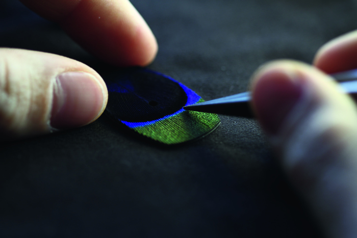 Su diseño rinde homenaje a un modelo de la década de los años 70. Su caja, de 39 milímetros de diámetro, está finamente elaborada en oro rojo 5N de 18 quilates. Las carátulas están preciosamente realizadas con plumas de pavo real y una de ellas está coronada con 120 diamantes redondos (0.71 quilates).