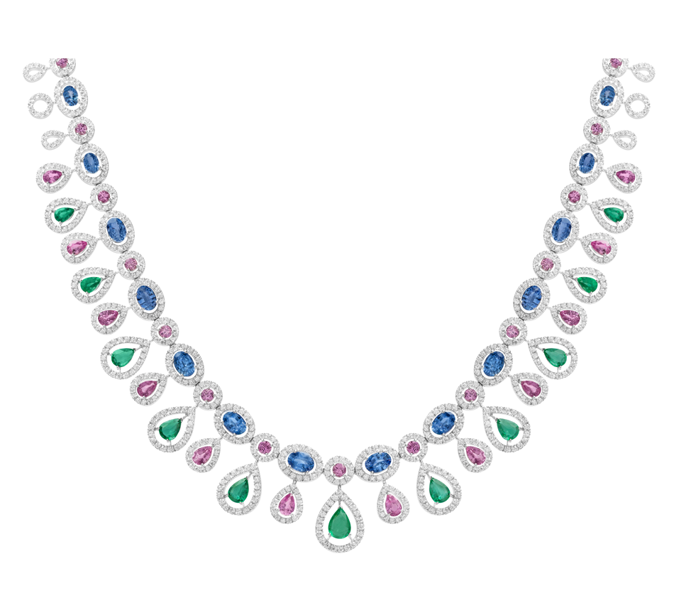 Montados sobre un lienzo de oro blanco deslumbrante gracias al engaste de diamantes talla brillante, los zafiros azules y rosas desatan un juego de color en conjunto con las esmeraldas corte gota. Este tipo de piedras son sumamente apreciadas en la Alta Joyería, y tras una minuciosa selección por parte de Berger Joyeros, se ha logrado un conjunto sumamente elegante y sofisticado.