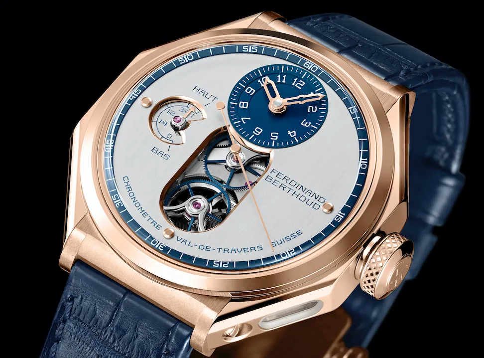 Presentada como única pieza, el Chronomètre FB 1 Edition Malaspina destaca una caja de 44 mm en forma octogonal de oro rosa de 18 k provista de cuatro ojos de buey de zafiro transparente. El grosos de 13 mm y la corono de 9 mm, hacen que su aspecto sea robusto sin dejar la finura de un modelo clásico.