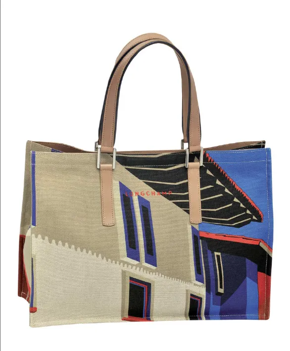 Exclusivamente creado para Longchamp, el motivo gráfico que distingue a esta bolsa fue inspirado por las casas típicas de las fincas de América del Sur y como un homenaje lúdico al arquitecto mexicano Luis Barragán, famoso por el uso audaz de bloques de colores.