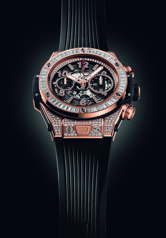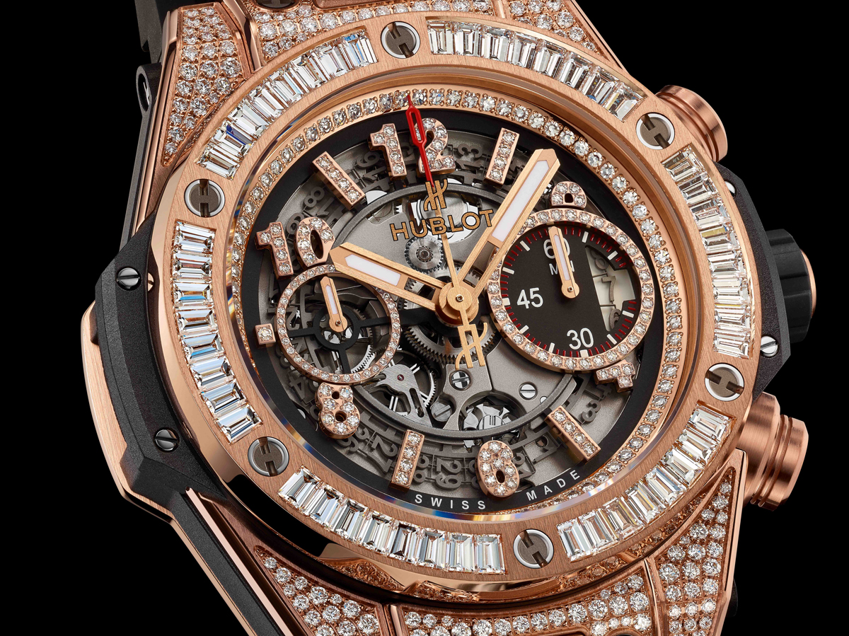 Hublot Big Bang Unico King Gold – Un reloj cronógrafo con calibre mecánico automático y función flyback. En este caso la pieza ha sido engastada con pavé de diamantes talla baguette (bisel) y corte brillante para el resto de la caja, índices y anillo interior. La carátula desnuda permite la admiración de la mecánica de este motor de manufactura, que vibra a 4 Hz durante 72 horas de autonomía. Su valor estimado supera los 45 mil dólares.