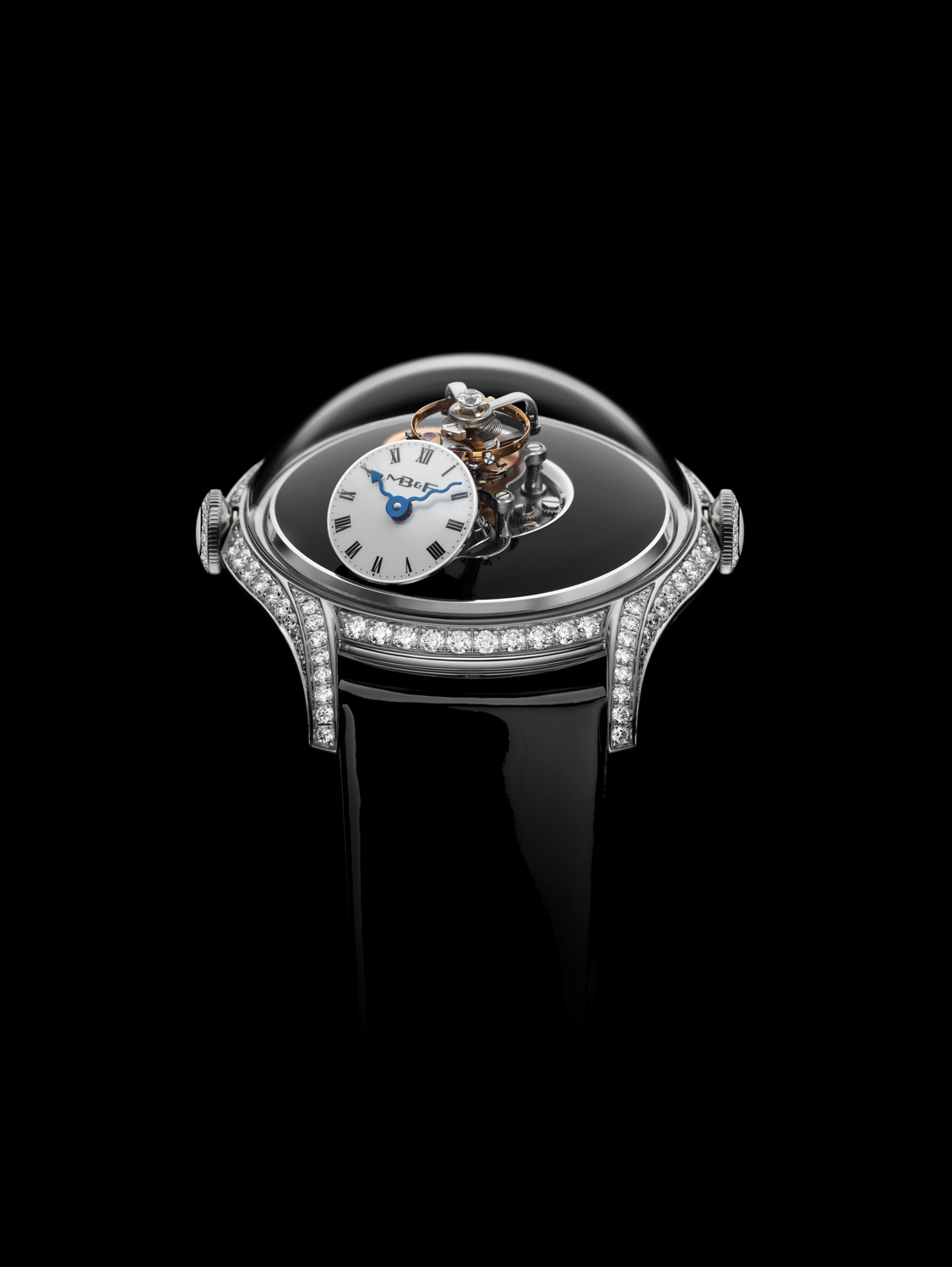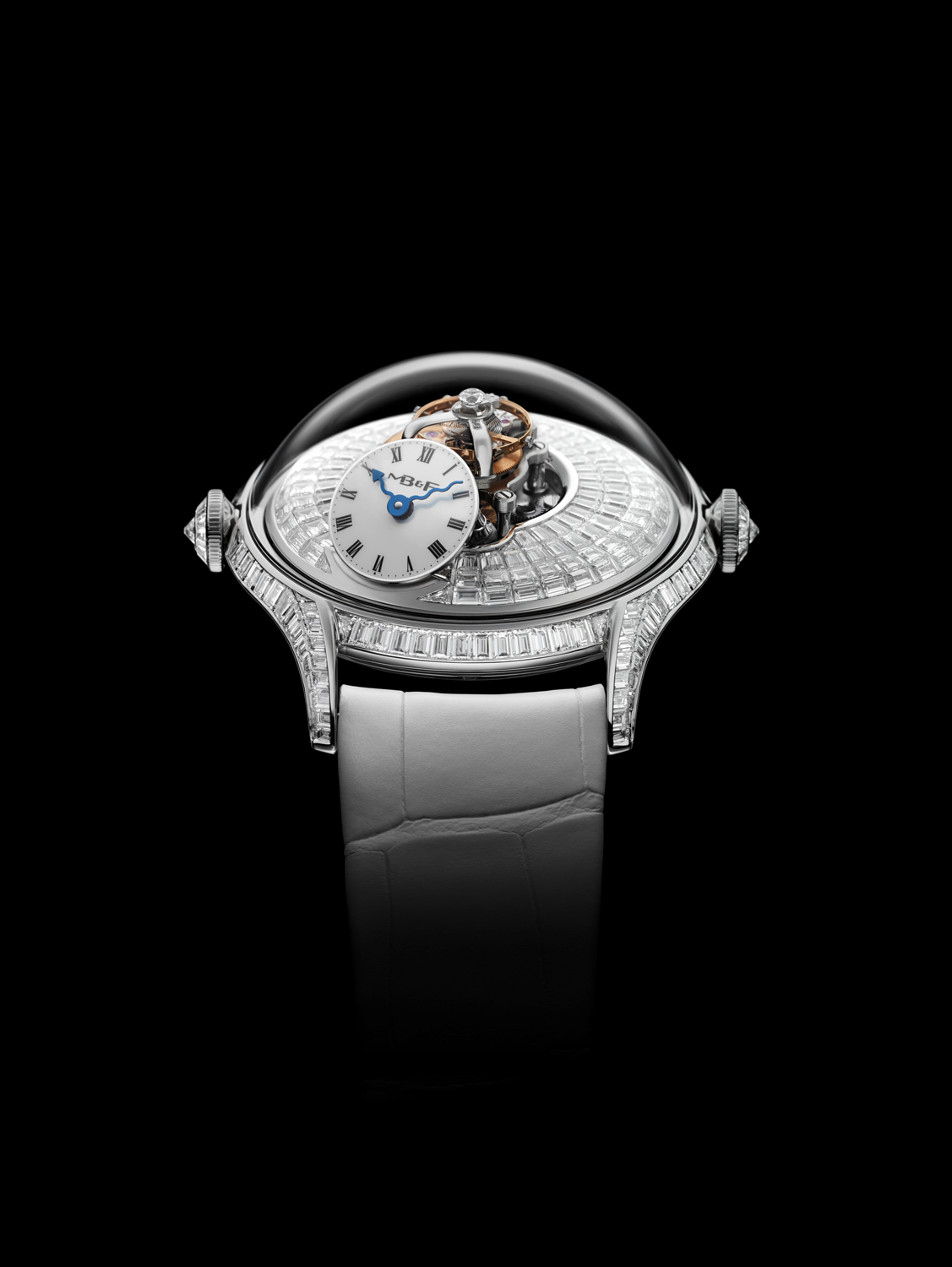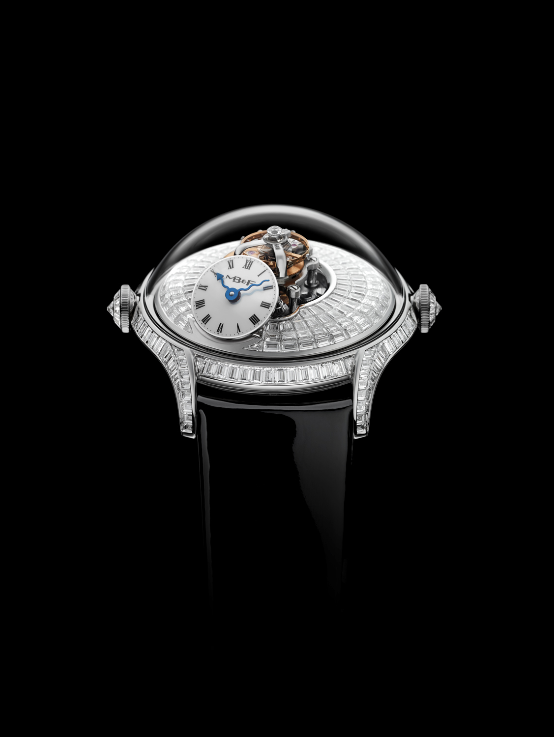 En cuanto a engaste, la pieza se presenta en tres diferentes variantes de engaste de diamantes: caja, carrura, cuernos y coronas; caja y placa engastadas en diamantes y una más, la más extrema, que luce pavé de diamantes talla baguette. Su cristal de zafiro es, como en todo MB&F, un sello de máximo nivel de pericia y artesanía.