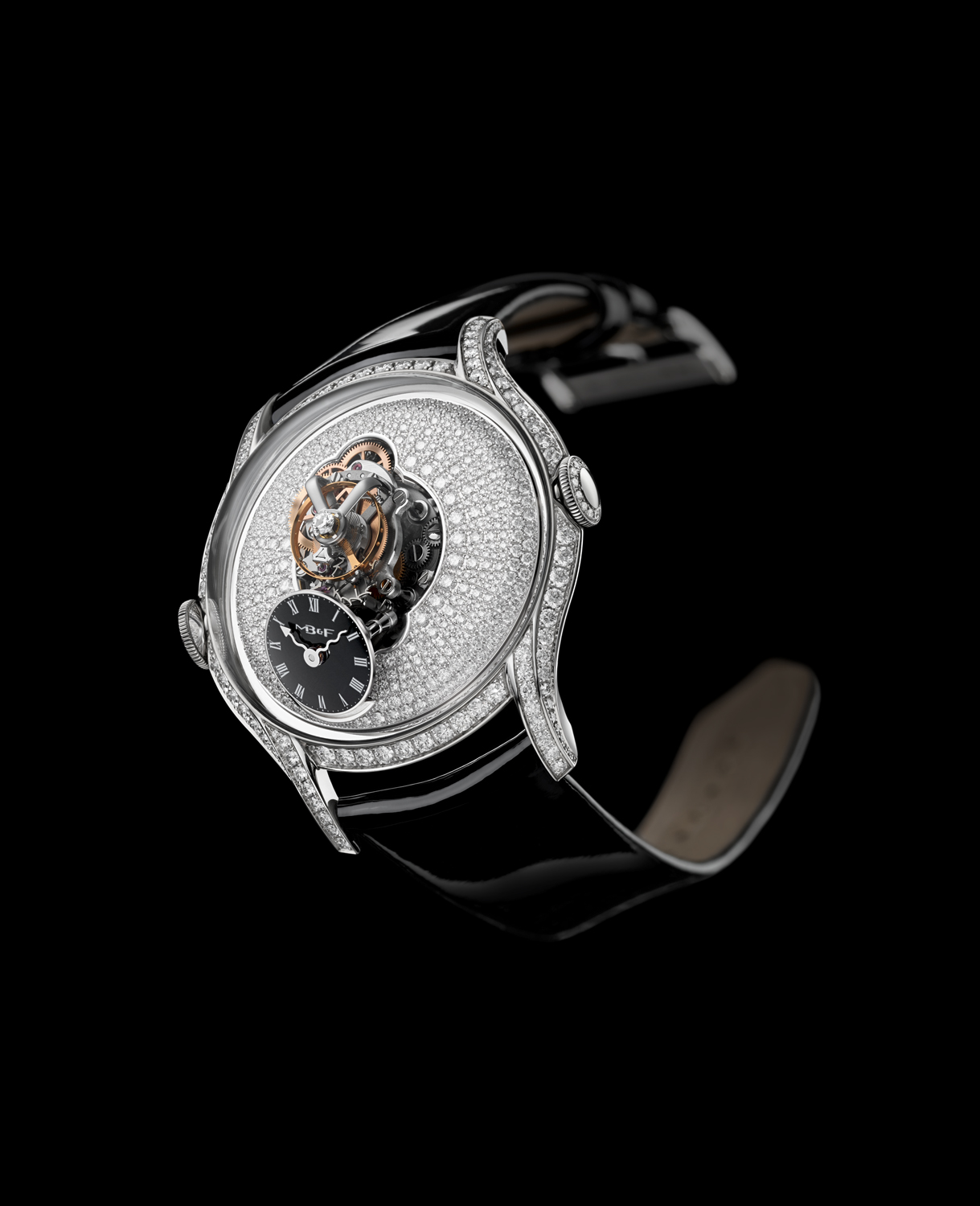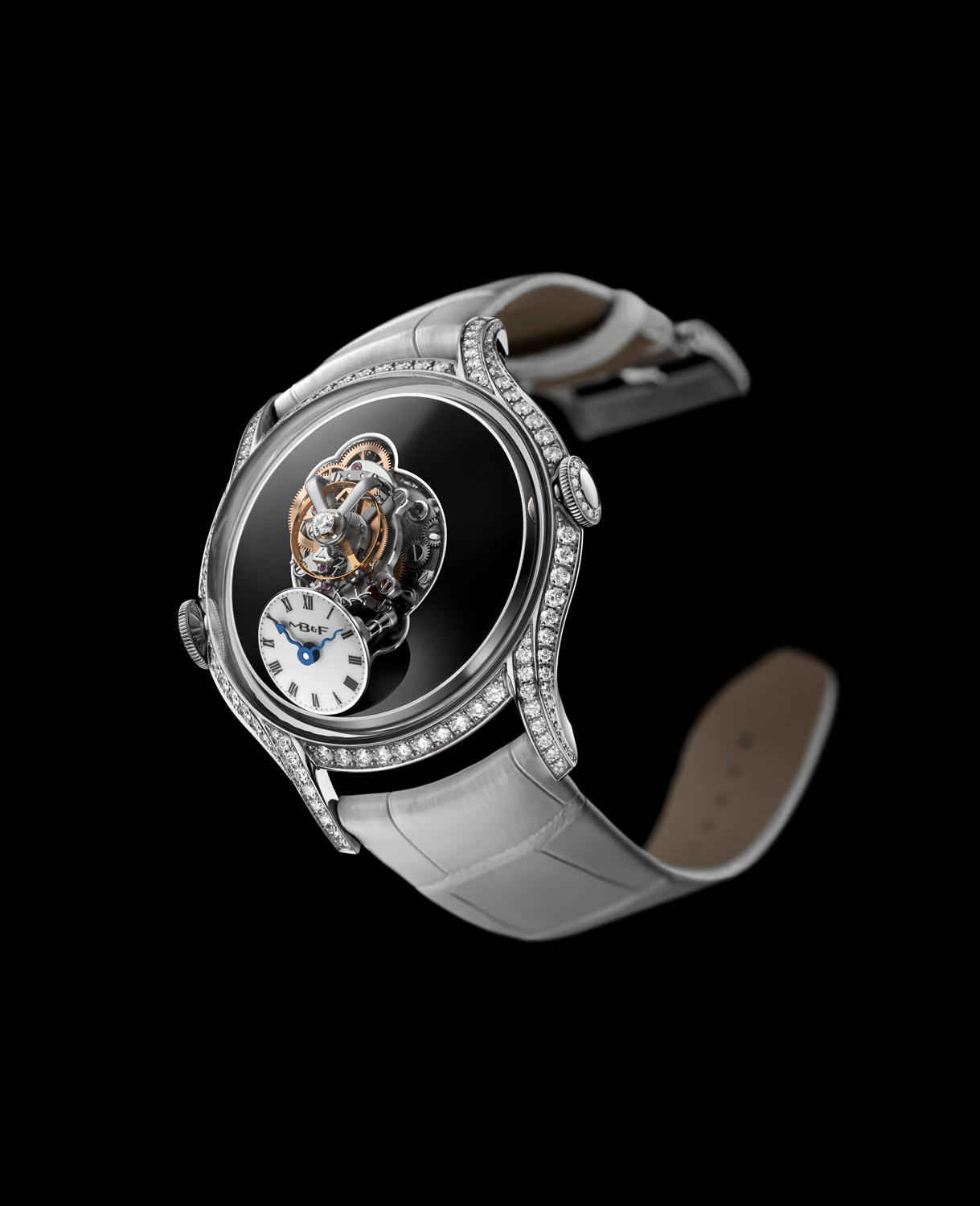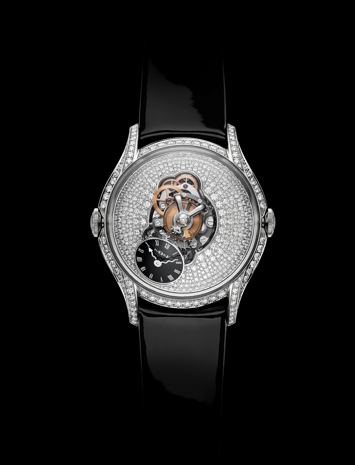 En cuanto a engaste, la pieza se presenta en tres diferentes variantes de engaste de diamantes: caja, carrura, cuernos y coronas; caja y placa engastadas en diamantes y una más, la más extrema, que luce pavé de diamantes talla baguette. Su cristal de zafiro es, como en todo MB&F, un sello de máximo nivel de pericia y artesanía.