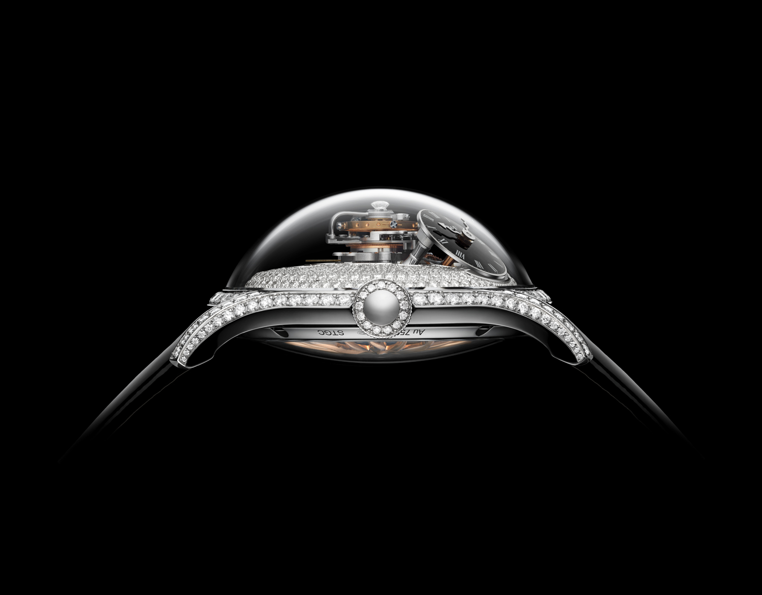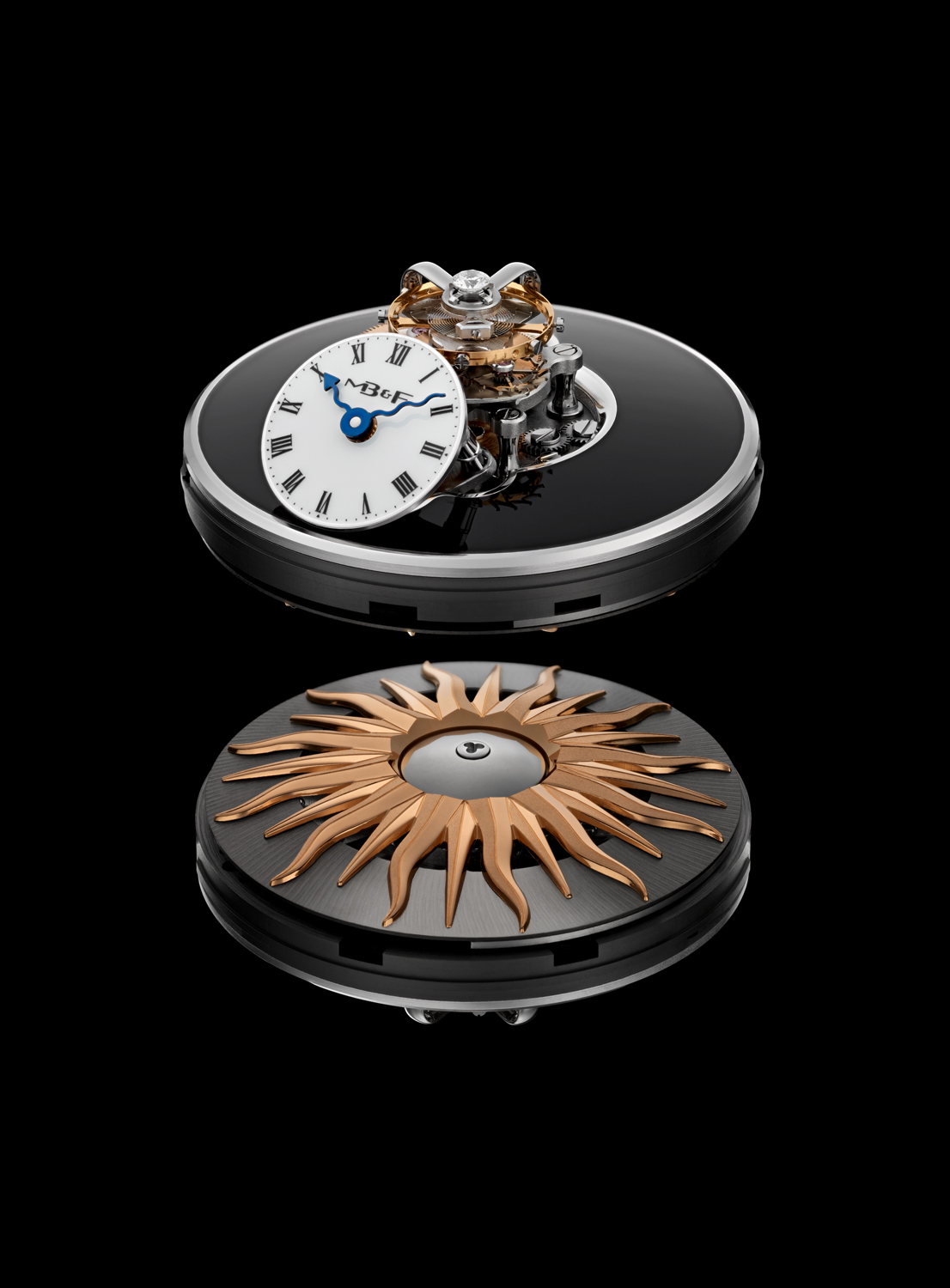 El fondo de la pieza es igual de espectacular, ya que ofrece un diseño de masa oscilante excepcional inspirado en el Sol y desarrollado en oro rojo con aleación de titanio y platino. La referencia no está limitada, y se abraza al pulso por diferentes configuraciones de correa de piel de cocodrilo color blanco o negro.