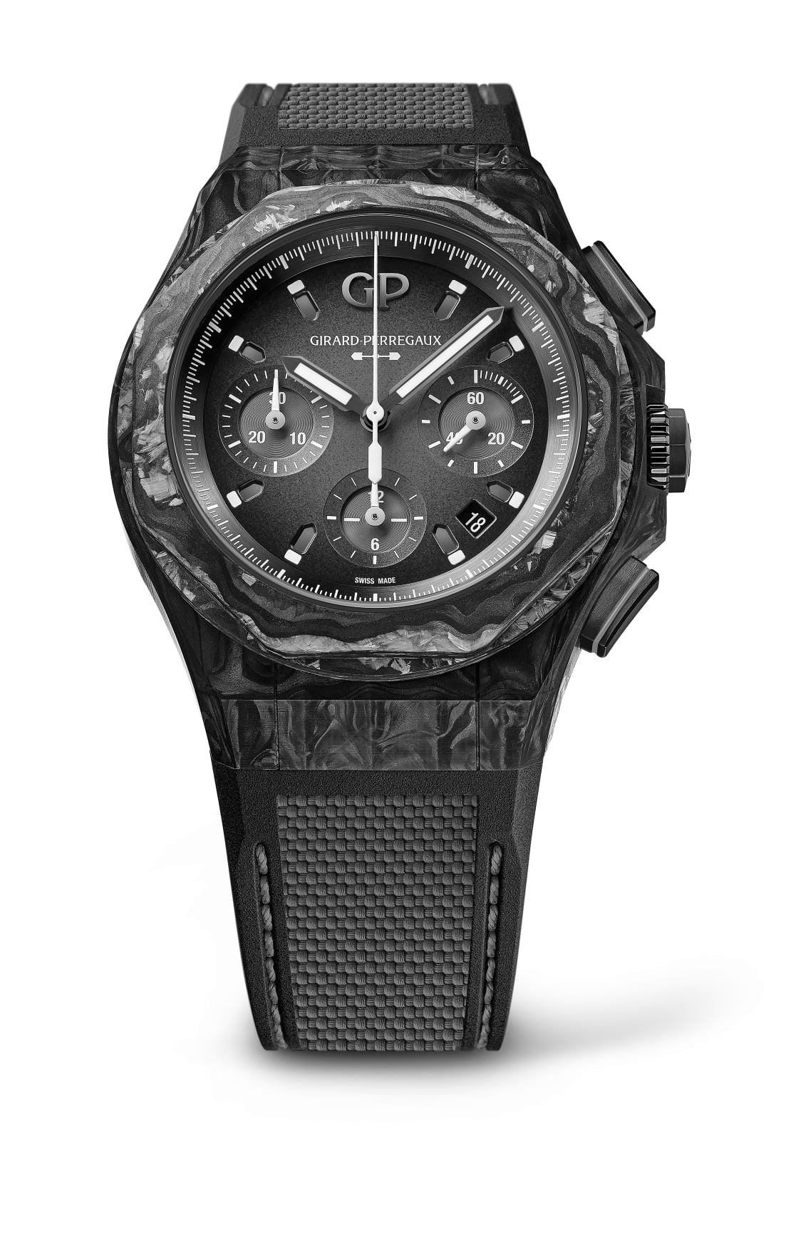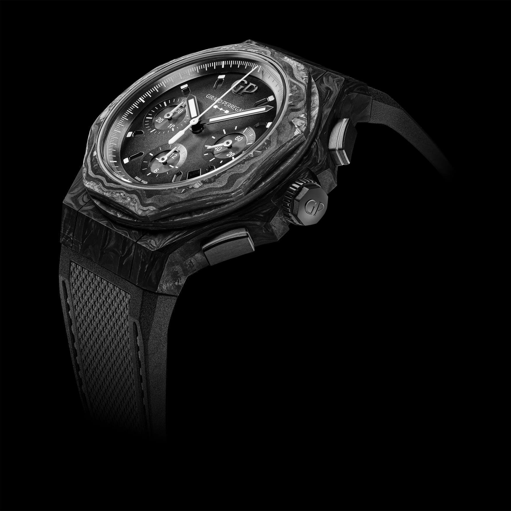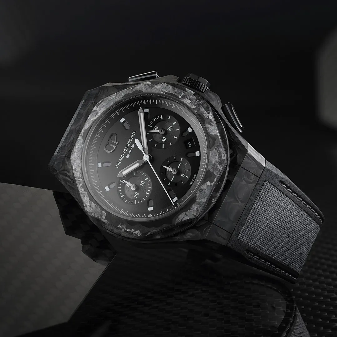 Mecánicamente cuenta con un movimiento de manufactura de cuerda automática, el Calibre GP03300- 1058 está contenido en una caja de 44 mm de diámetro. Altamente ligero, este reloj pesa únicamente 94 gramos gracias al trabajo de este material que fusiona la fibra de carbono y la fibra de vidrio a altas temperaturas.