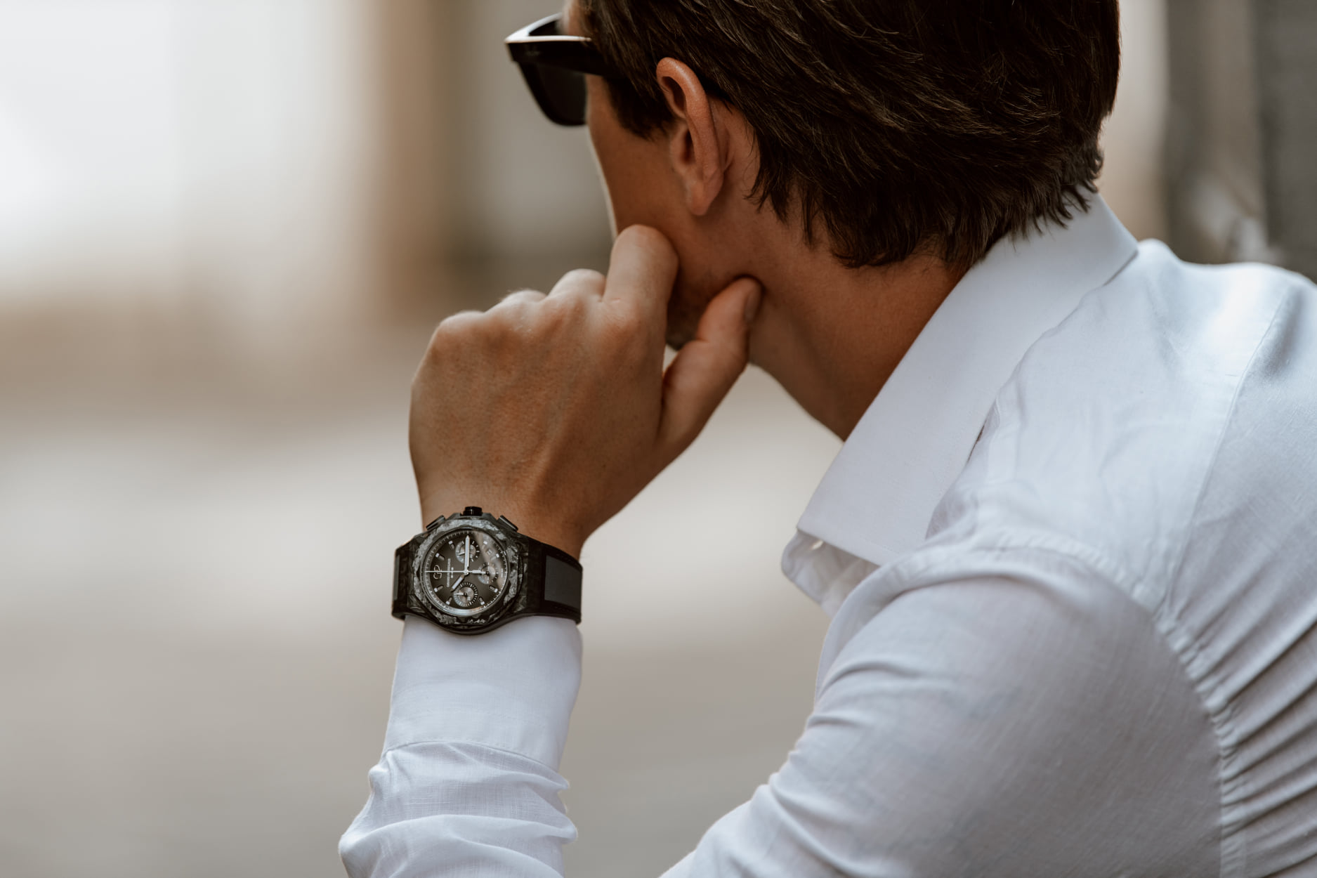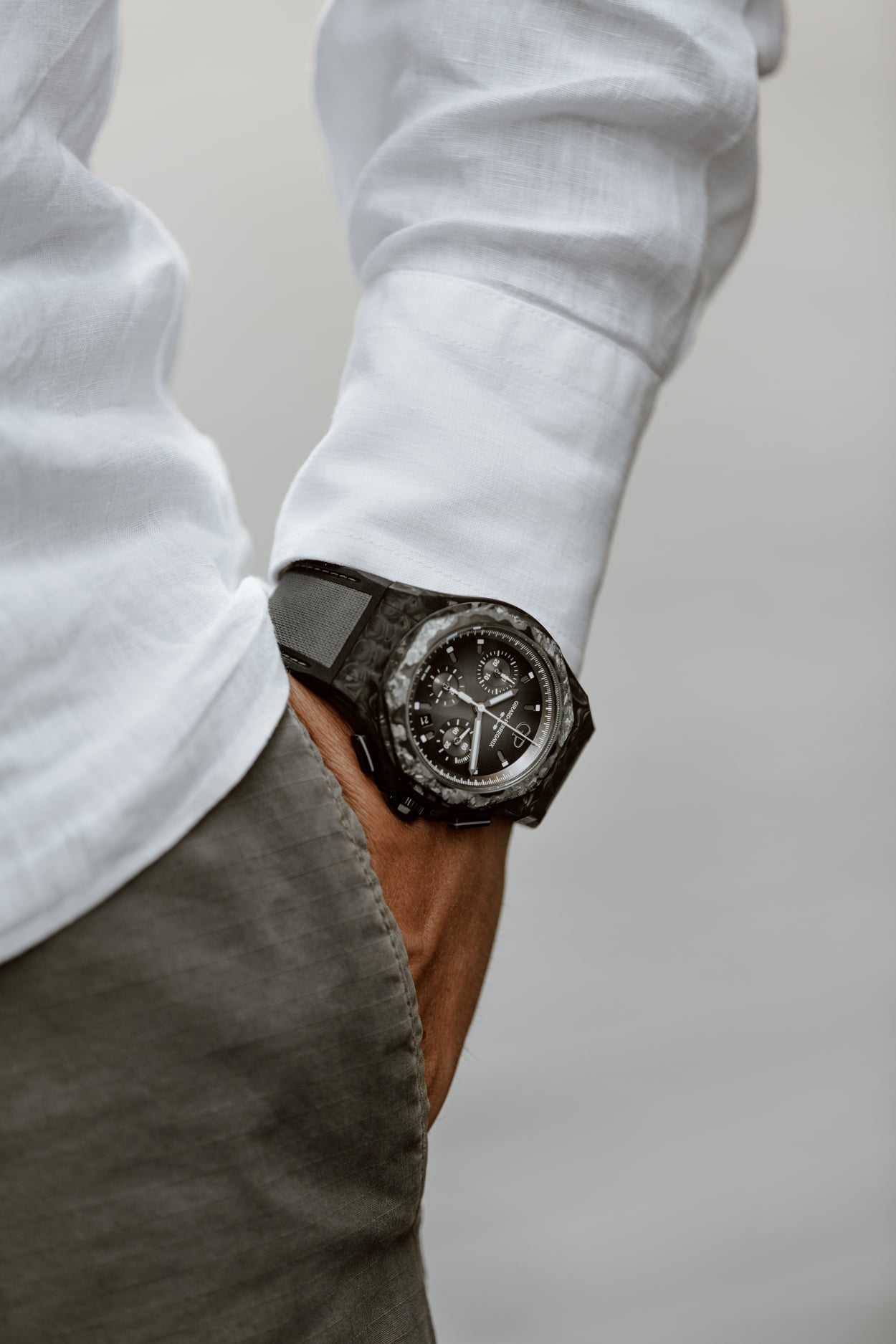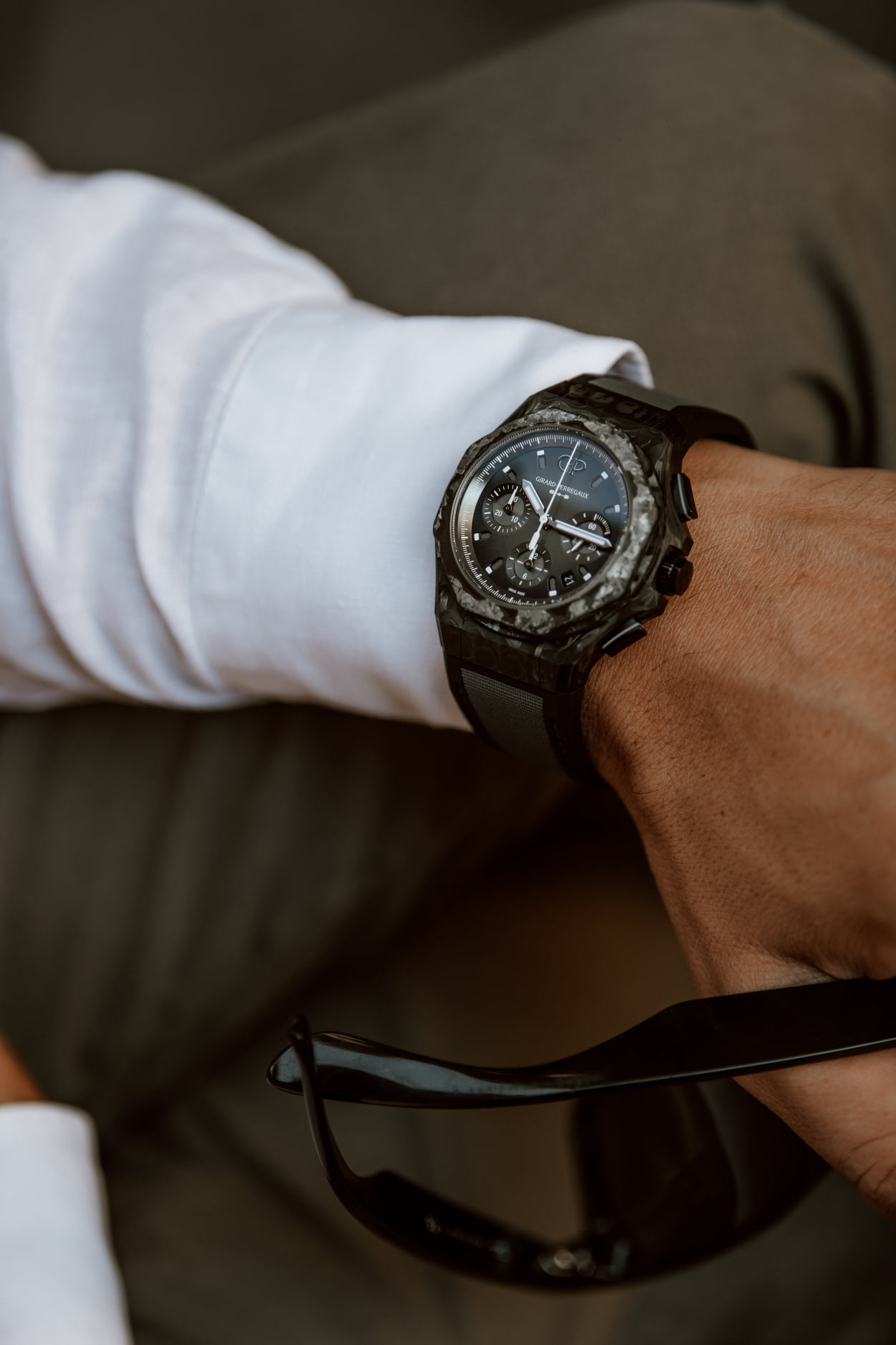 Mecánicamente cuenta con un movimiento de manufactura de cuerda automática, el Calibre GP03300- 1058 está contenido en una caja de 44 mm de diámetro. Altamente ligero, este reloj pesa únicamente 94 gramos gracias al trabajo de este material que fusiona la fibra de carbono y la fibra de vidrio a altas temperaturas.