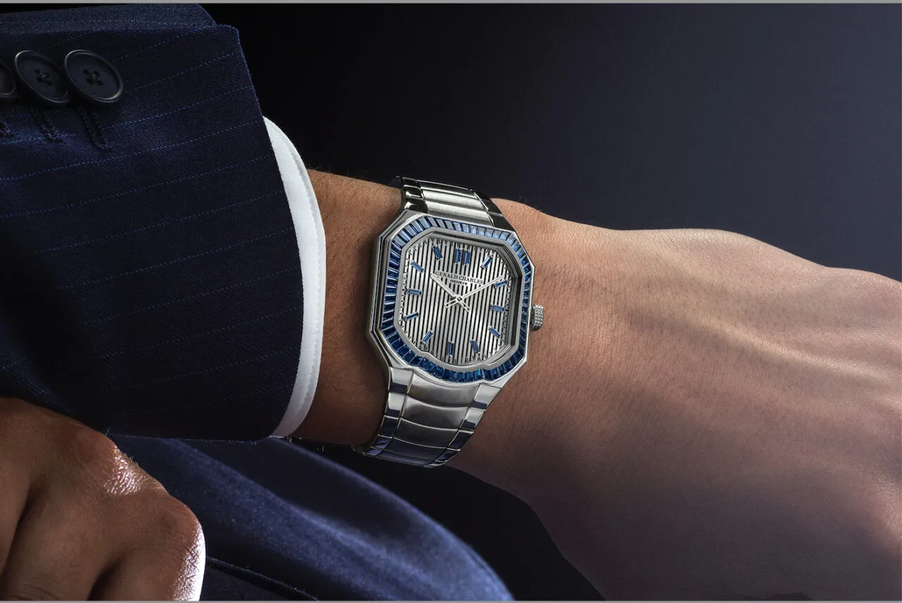 El cierre de mariposa y los tornillos ocultos otorgan uniformidad al diseño además de una comodidad excepcional. Los acabados de la pieza son también protagonistas pues el eslabón central cuenta con un cepillado vertical que hace eco de la dirección del motivo Côtes de Genève que adorna la carátula fabricada en plata. Ésta cuenta con un relieve lineal construido mediante dos niveles independientes lo que le otorga una profundidad real.