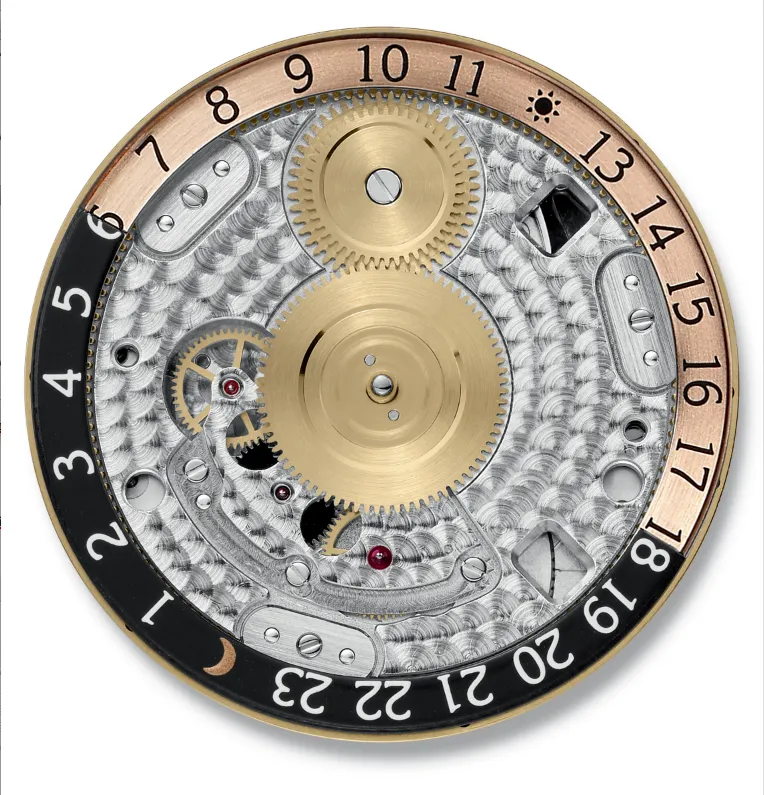 El sutil juego de contrastes entre el oro rosa de la caja y el negro de la esfera, así como el recordatorio en el anillo de las ciudades, le imprimen un carácter y fuerza excepcionales a este modelo. Asimismo, el color oro hace resaltar los índices, las agujas y el anillo de las 24 horas.