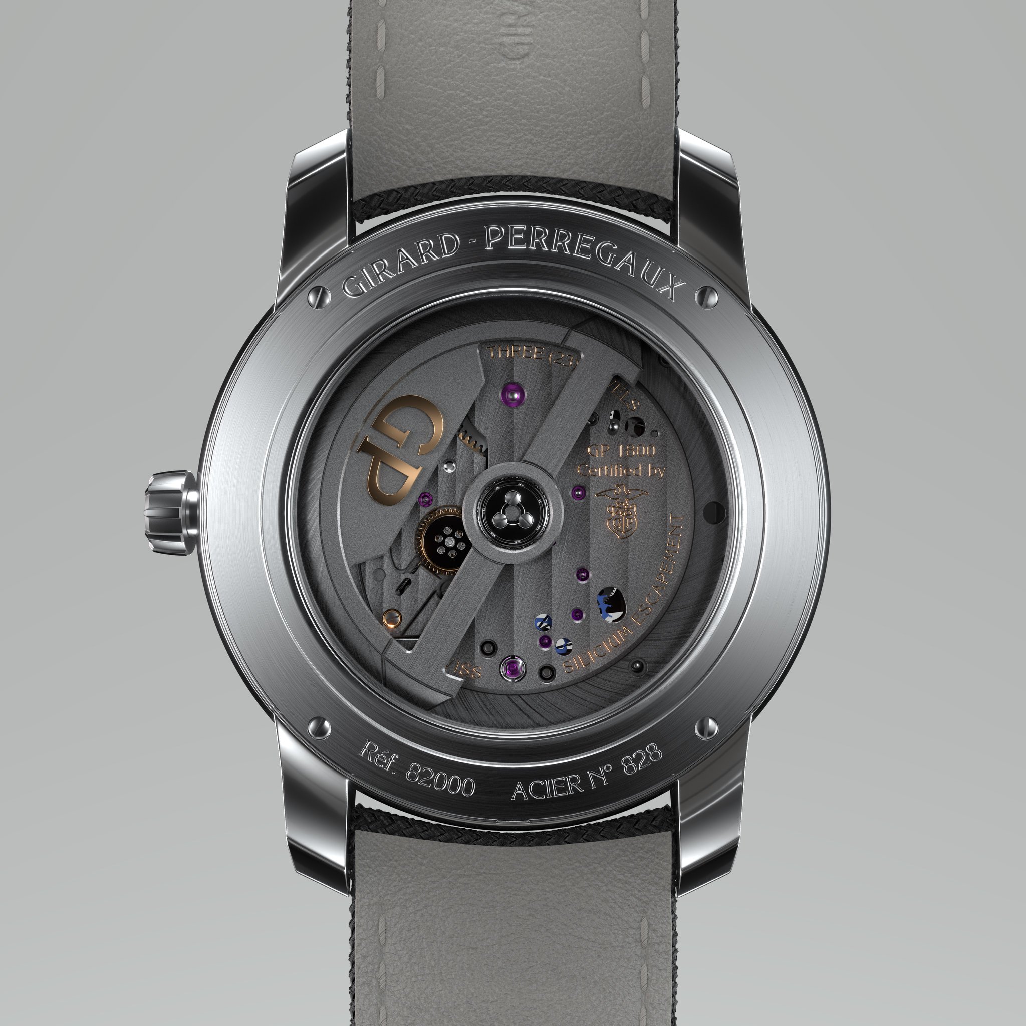Se emplea el robusto calibre de manufactura GP1800, modificado para ofrecer una marcha a 4 Hz con 54 horas de autonomía. Decorado con Côtes de Genève, biselados, arenados y revestido en color gris oscuro, luce tanto por la cara principal como visto desde el fondo.