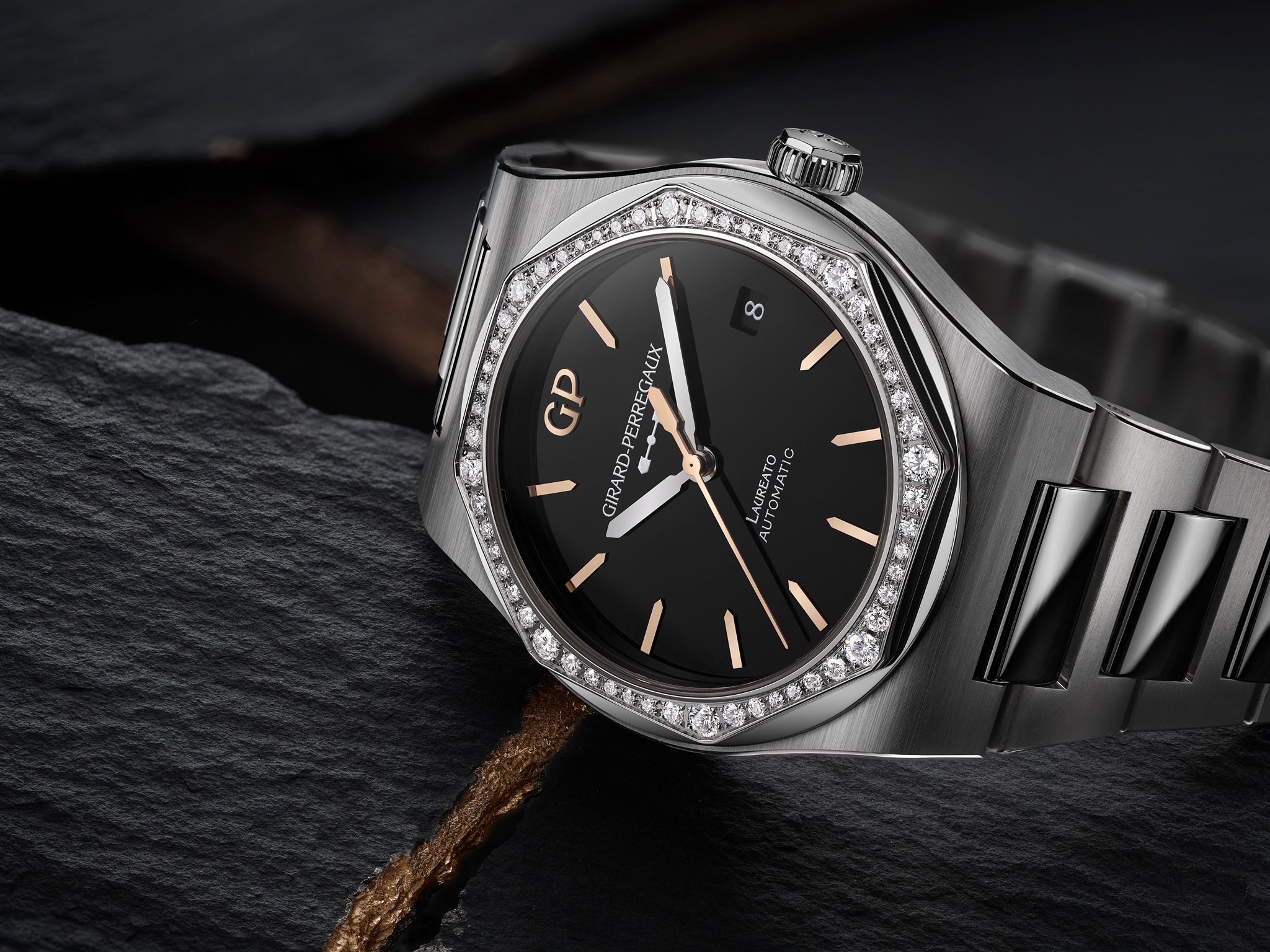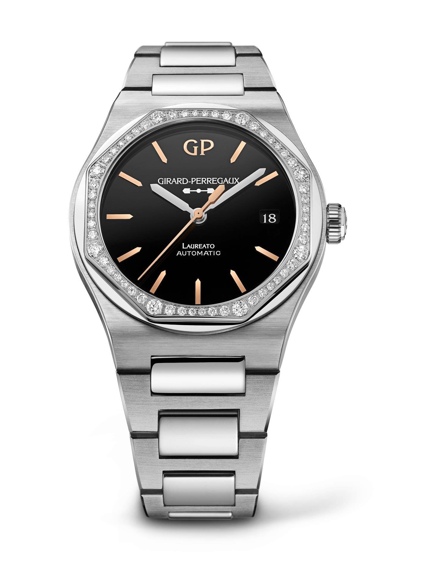 El Laureato Infinity está disponible en dos tamaños diferentes, uno de 38 mm y otro de 42 mm. Ambas versiones vienen alojadas en cajas de acero inoxidable, destacan sus agujas de horas y de minutos en color plateado y con forma de bastón, imitando la apariencia de la caja. Mientras que el segundero central, los índices aplicados y el logotipo de GP, todos en oro rosa, refuerzan la lujosa apariencia del modelo. La fecha se muestra con números blancos, con fondo negro, a juego con el color de la esfera. El bisel del Laureato de 38 mm está adornado con 56 diamantes de talla brillante, con 0.90 quilates en total.