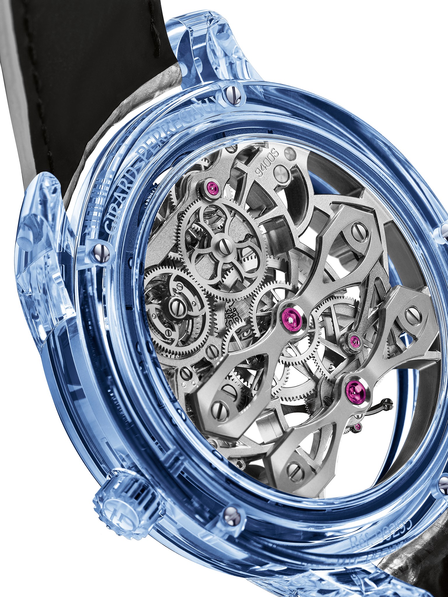 - Calibre: GP09400-1035 de manufactura con tourbillon, todo esqueletado y tres puentes funcionales finamente decorados