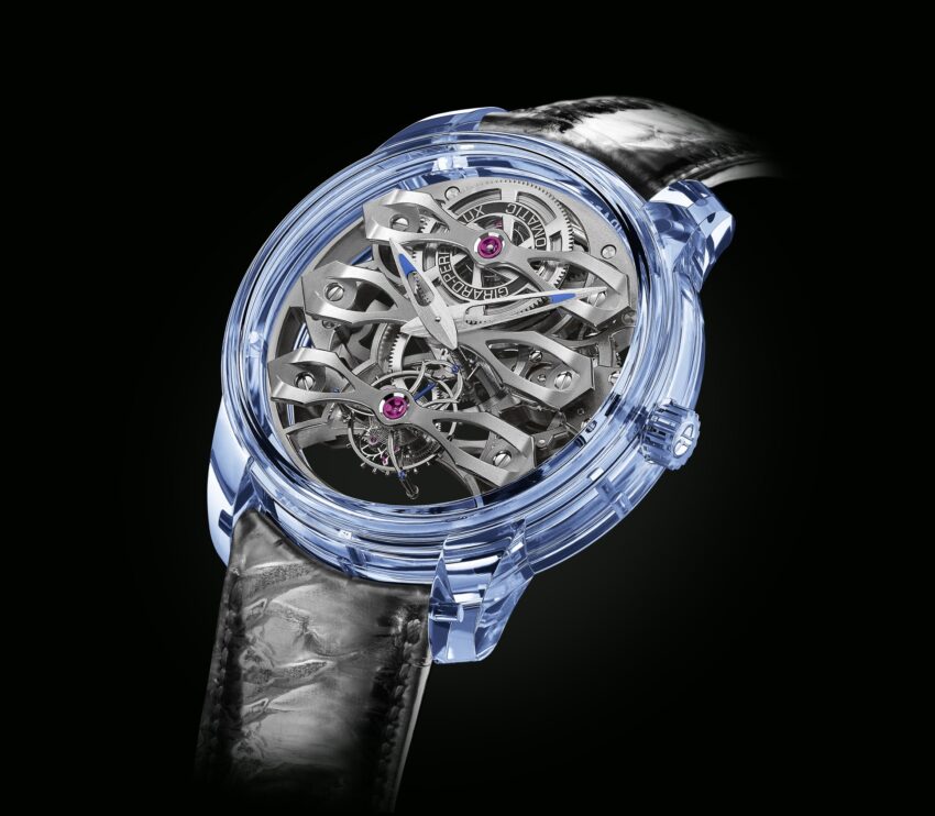 Quasar Azure honra el legado de los tres puentes producto de la máxima visión re ingeniería de la firma en el siglo pasado. Ahora lo hace con un diámetro de 46 mm, y con una caja mecanizada a partir de un solo bloque de zafiro que se pule meticulosamente a la perfección. Todo está construido para maximizar la vista del arquitectónico calibre esqueletizado, que a su vez se basa en el principio de transparencia.