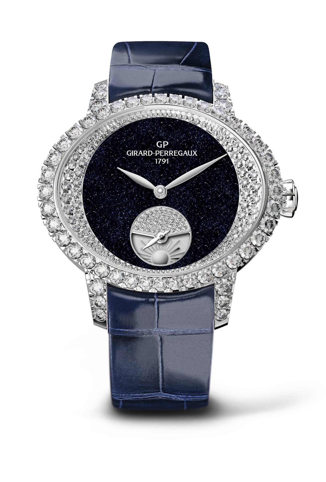 Esta referencia de Alta Relojería y Joyería se presenta como un verdadero platillo fuerte para las damas amantes de la noche. El dial está hecho por medio de una aventurina que replica las de un cielo estrellado, mientras que el engaste de diamantes le brinda ese componente de brillantez que a las mujeres vuelve locas.
