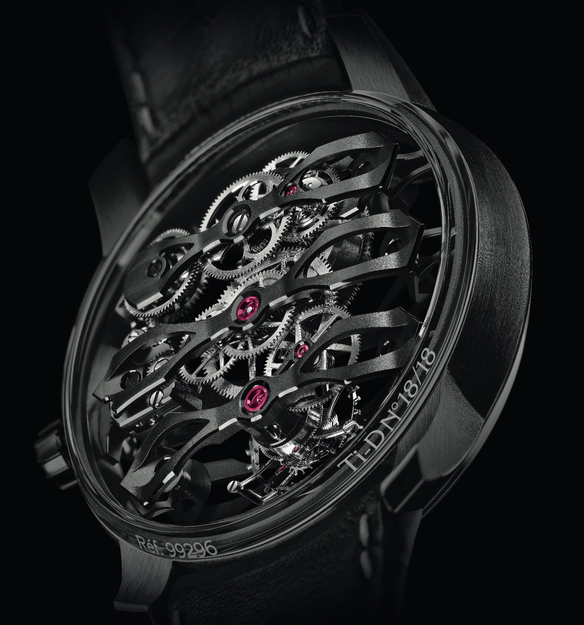 - Caja: 44 x 15.52 mm de titanio grado 5 con revestimiento DLC negro; cristal de zafiro por ambos lados, con tratamiento anti-reflejos; corona a juego